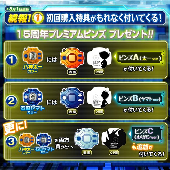 Ils ne seront disponibles uniquement en deux coloris, l’orange et le bleu, correspondant aux personnages de Taichi Kamiya et Yamato Ishida et seront disponibles ensemble en Septembre prochain.