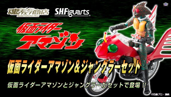 As Kamen Rider Faiz and his Auto Vajin and Kamen Rider Shin Ichigo with the Shin Cyclone before, the Jungler will release simultaneously alone and in a pack with the S.H.Figuarts figure of Kamen Rider Amazon for an release on next January.