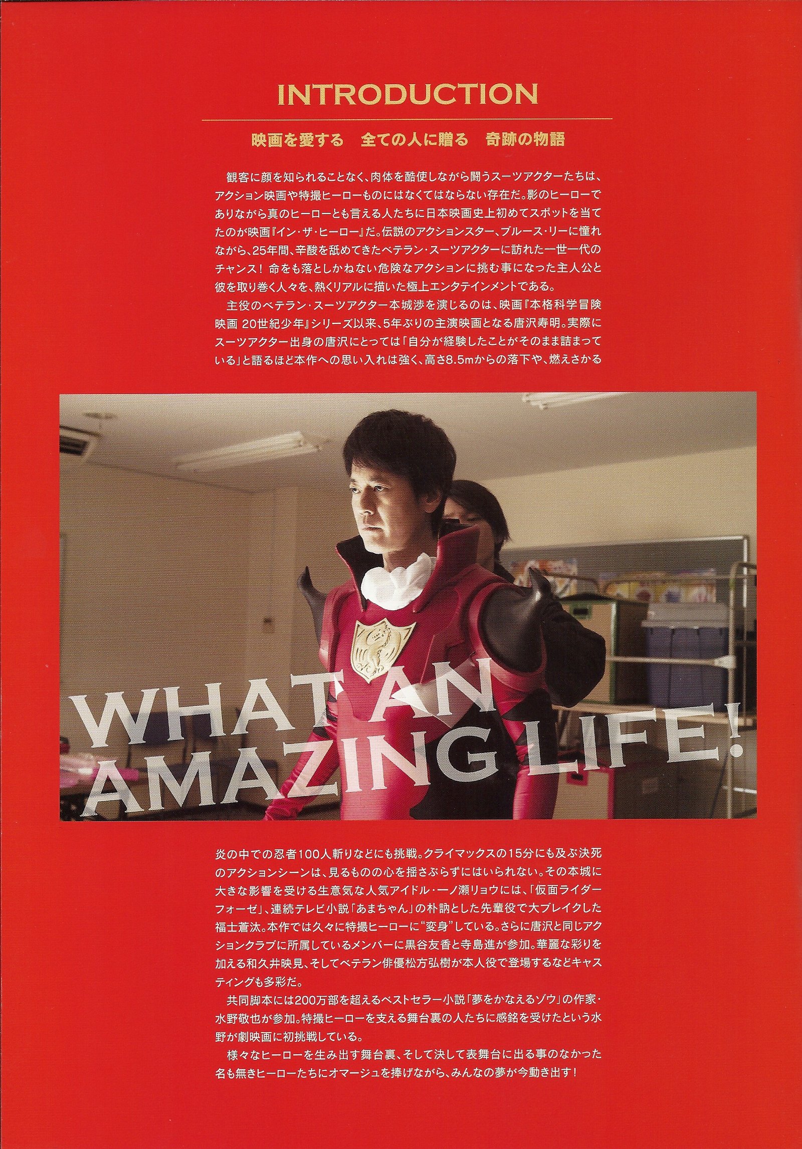 Wataru Honjo (Toshiaki Karasawa), 48 ans, est le leader de la HAC « Hero Action Club » qui est un groupe de cascadeurs pour films d’action. C’est un vétéran dont les problèmes de santé, qu’il cache à tout le monde et en premier lieu à son ex-femme et sa fille, le font de plus en plus souffrir, surtout au niveau du cou. Il peine à cacher son mal. Un jour, le jeune Ryo Ichinose (Sota Fukushi (alias Gentaro / Kamen Rider Fourze)), débarque dans la production du projet en cours, Kamiryu Senshi Dragon Four. Il passe devant Honjo pour le rôle du nouveau personnage, Dragon Black, dans l’adaptation en film de la série, dont il est cascadeur principal, et dont on lui avait promis le rôle.