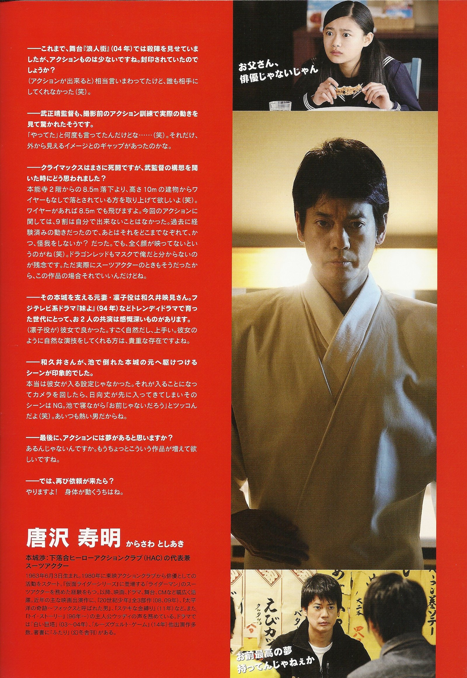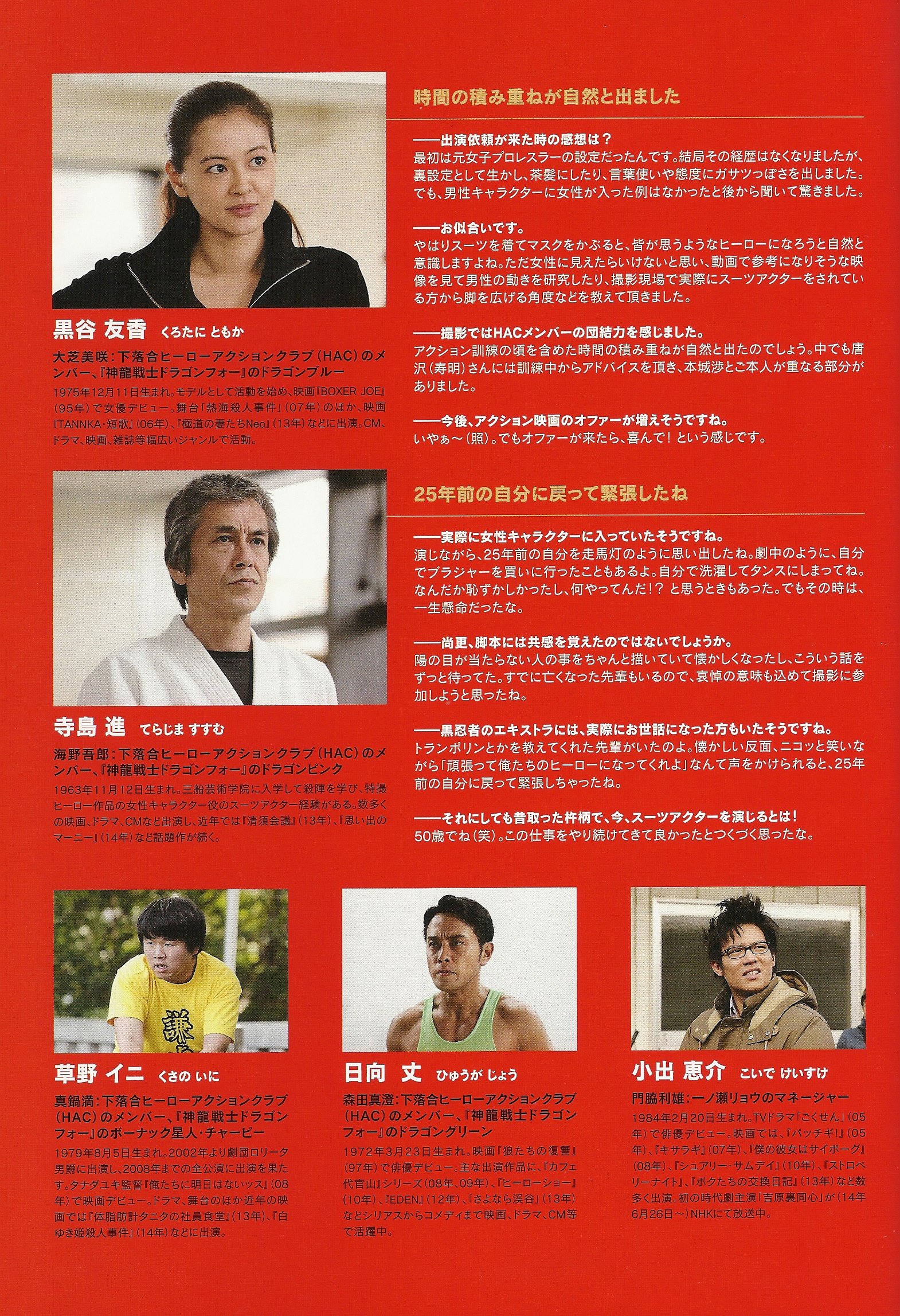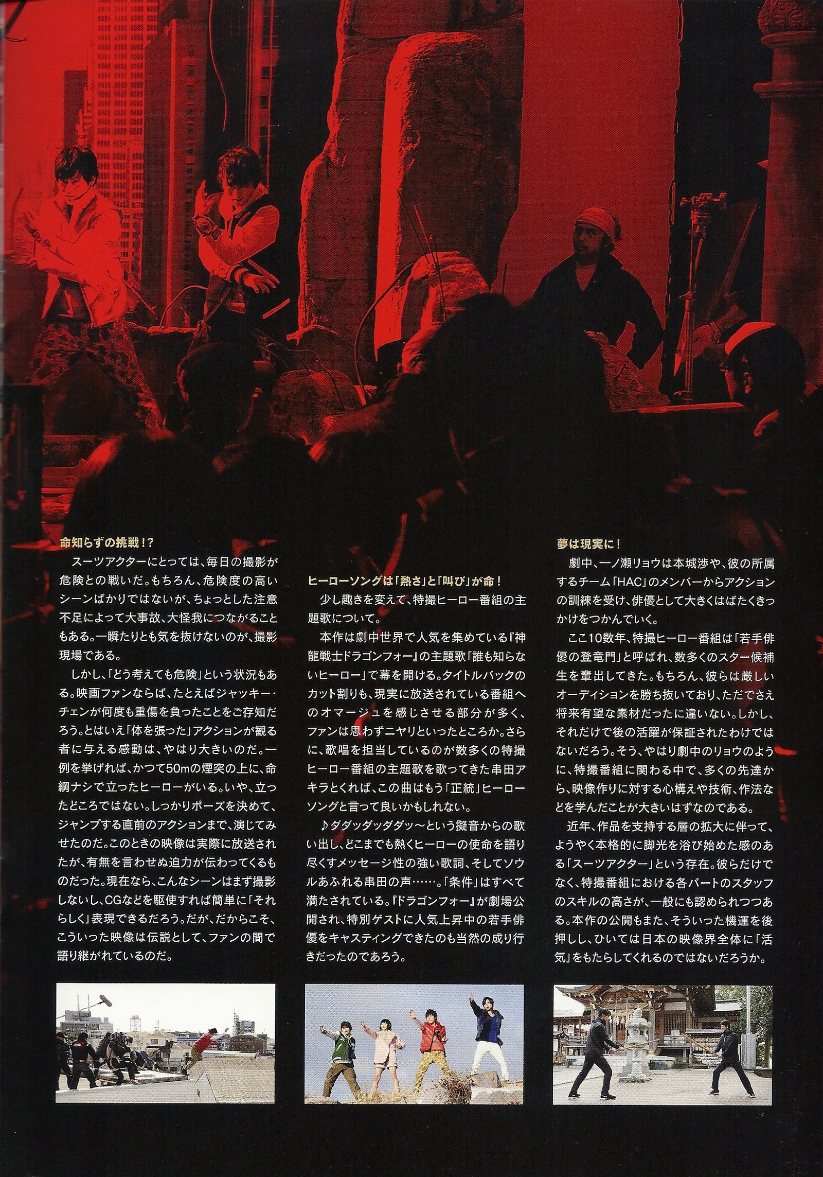 Wataru Honjo (Toshiaki Karasawa), 48, is the leader of the HAC « Hero Action Club », an action actors club. He is a veteran whose health problems he’s hiding to his wife and his daughter are starting to make him suffer, especially in the neck. He’s having difficulties to hide it. One day, the young Ryo Ichinose (Sota Fukushi (aka Gentaro / Kamen Rider Fourze)), steps in the current project of the Club, Kamiryu Senshi Dragon Four. The production promised the role of the new character, Dragon Black, to Wataru, but instead, Ryo gets it in the movie adaptation of the series.