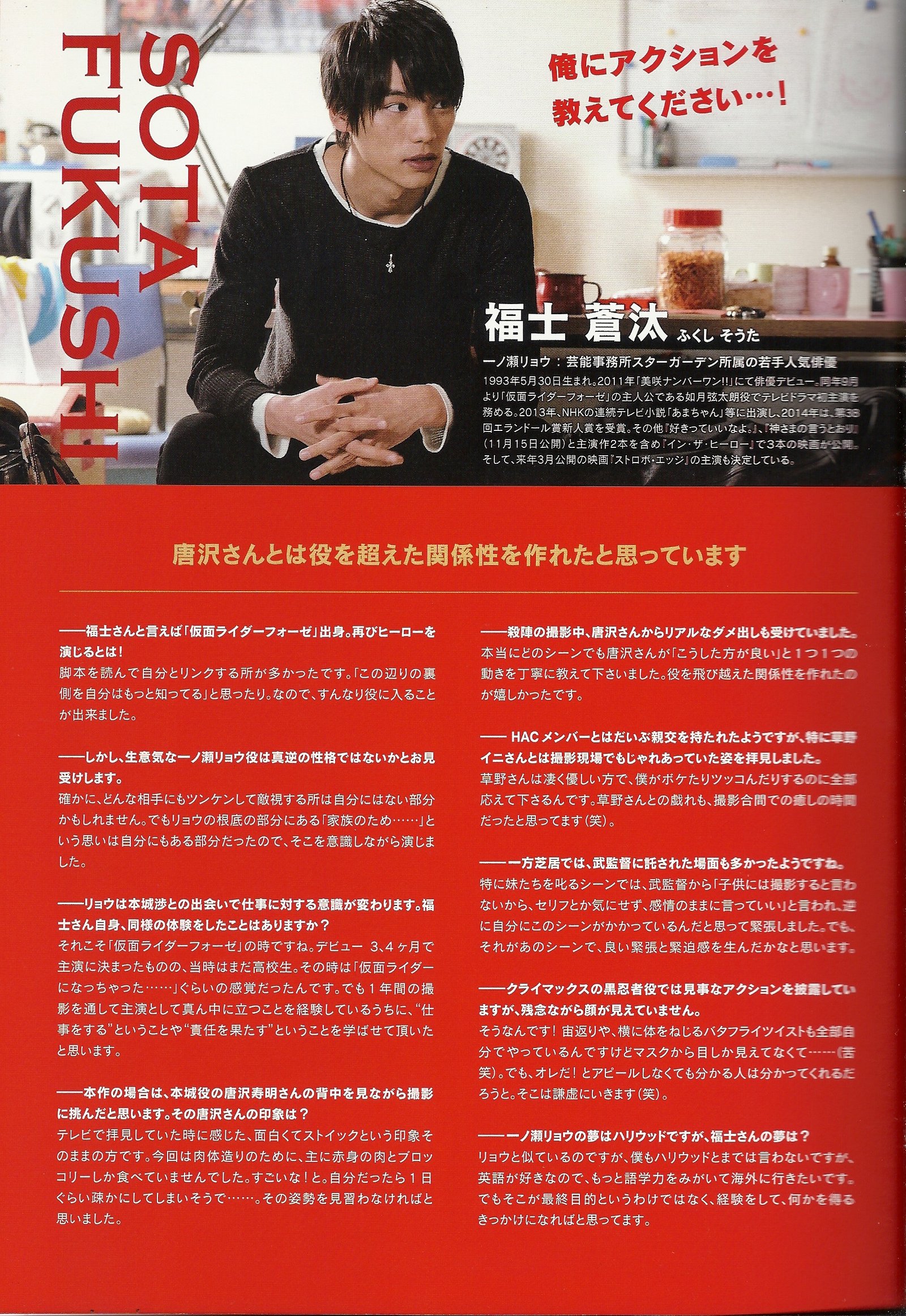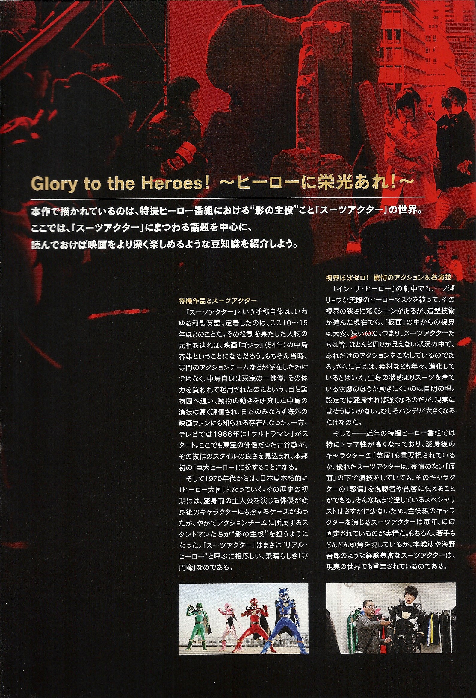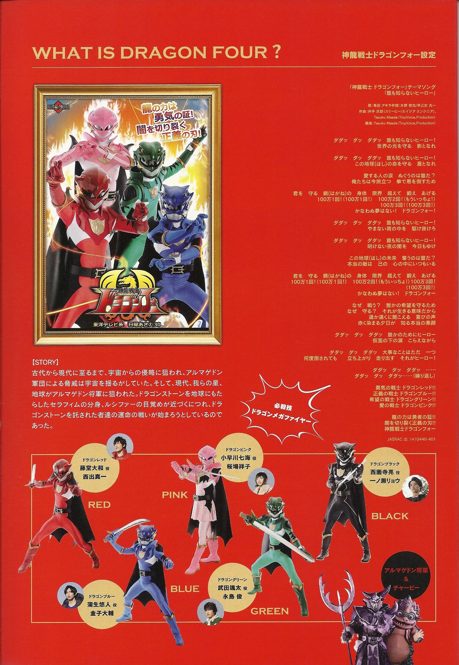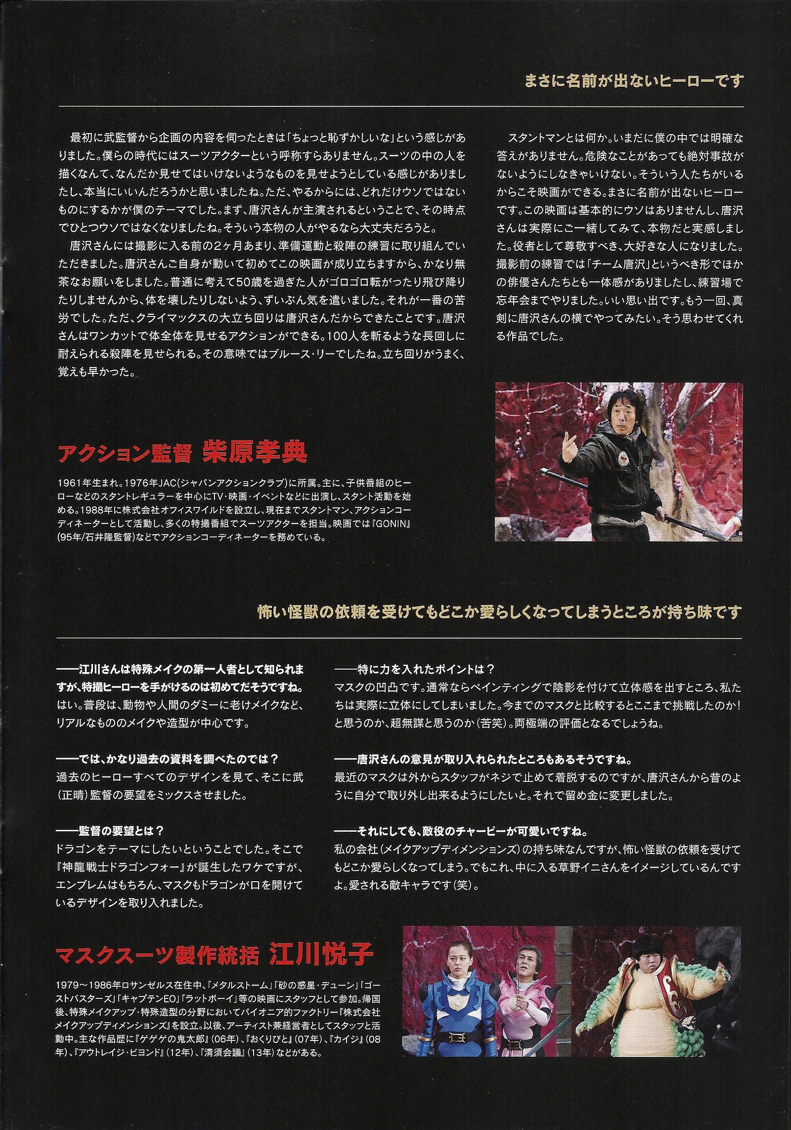 Wataru Honjo (Toshiaki Karasawa), 48, is the leader of the HAC « Hero Action Club », an action actors club. He is a veteran whose health problems he’s hiding to his wife and his daughter are starting to make him suffer, especially in the neck. He’s having difficulties to hide it. One day, the young Ryo Ichinose (Sota Fukushi (aka Gentaro / Kamen Rider Fourze)), steps in the current project of the Club, Kamiryu Senshi Dragon Four. The production promised the role of the new character, Dragon Black, to Wataru, but instead, Ryo gets it in the movie adaptation of the series.