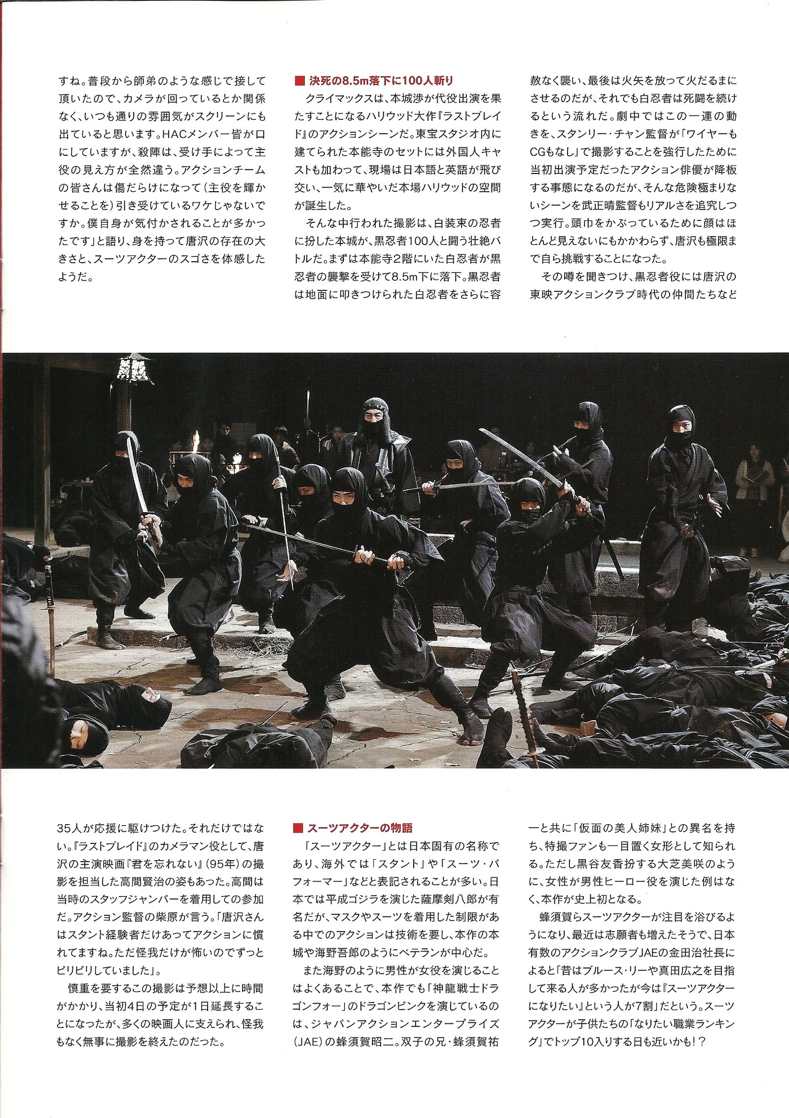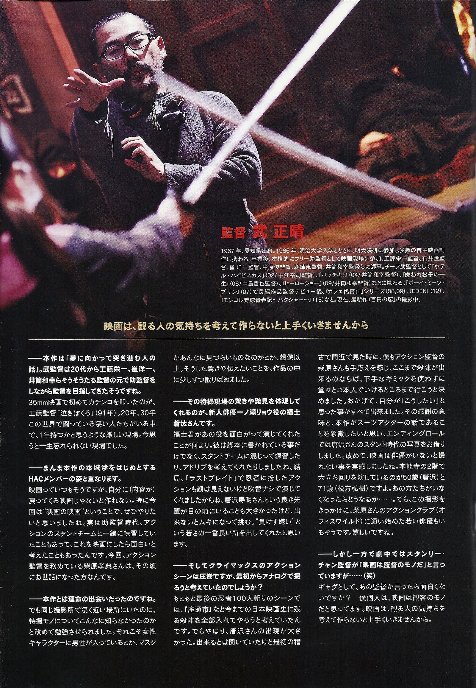 Mais, vu que le producteur désire faire son film à « l’ancienne » sans FX ou autres CG, Ichinose abandonne devant la trop grande dangerosité des cascades et c’est finalement vers Honjo que les producteurs se tournent…