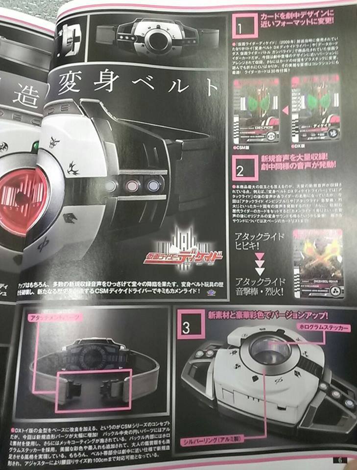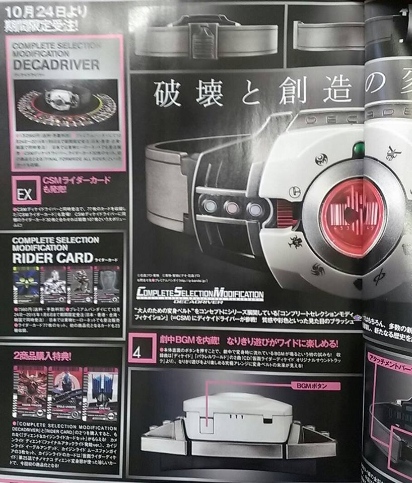 Après les DoubleDriver, Fang Memory, LostDriver et AccelDriver de la série Kamen Rider W et le Kabuto Zecter de Kamen Rider Kabuto, voici une nouvelle ceinture de la gamme Complete Selection Modification à être dans les pages des magazines : le DecaDriver, l’appareil de transformation du héros Kamen Rider Decade, de la série du même nom. Ces images nous montre la ceinture sur toutes les coutures ainsi que des aperçus du futur ensemble de cartes associées qui sera aussi commercialisé.