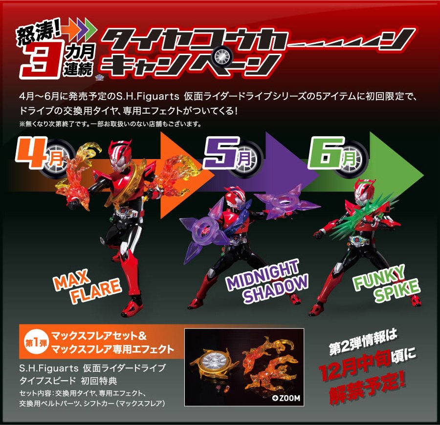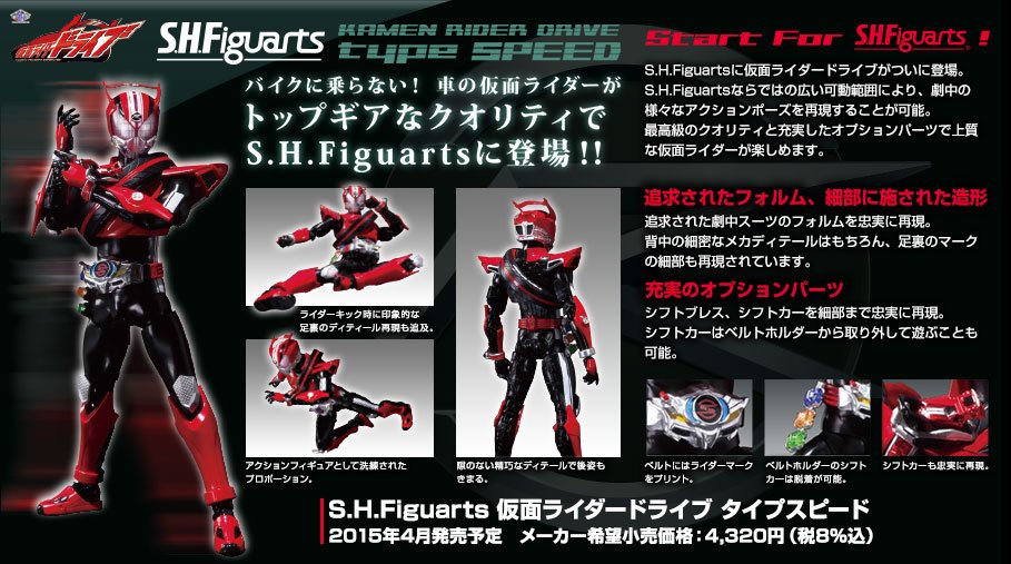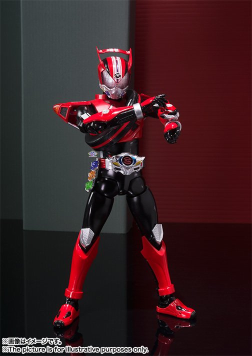 La première figurine S.H.Figuarts du héros sera sa première forme appelée Type Speed et sera disponible en Avril prochain. La sortie de cette figurine sera accompagnée peu de temps après par la voiture Tridoron ainsi qu’un ensemble regroupant trois Tire différents qui pourront être interchangeable sur la figurine du héros : Max Flare, Midnight Shadow et Funky Spike.