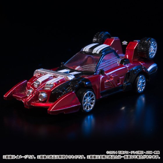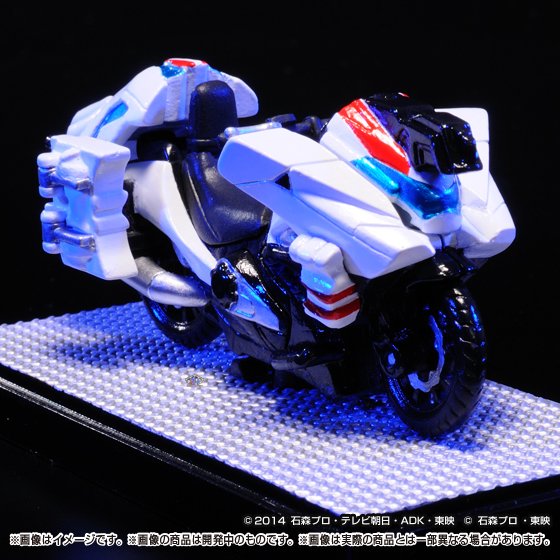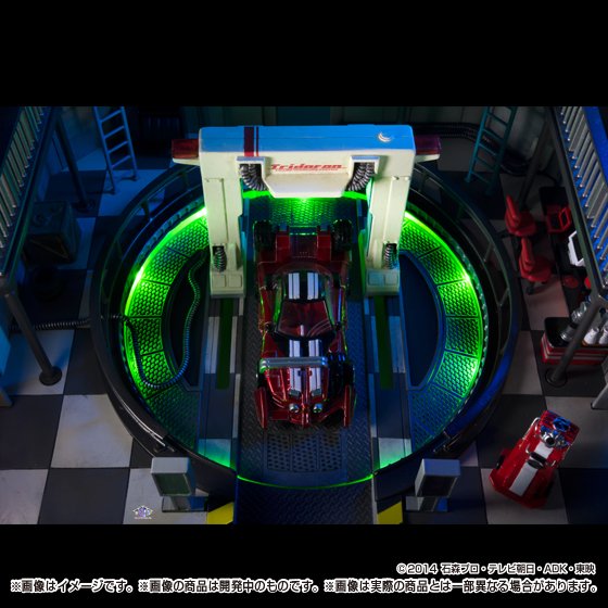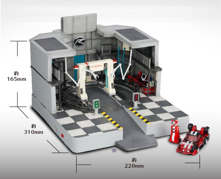 The Drive Pit is the place where normally is stored Tridoron, the car of the hero Kamen Rider Drive in his eponymous series. Now is a reproduction of this Drive Pit which is marketed. This reproduction, equipped with lights, is 16.5 cm high, 22 cm wide, 31 cm long and will be provided with a Tridoron Type Speed slightly smaller than a standard Shift Car. It will be possible to buy separately an set composed of Tridoron Type Wild, Tridoron Type Technic, Ride Chaser (motorcycle of Mashin Chaser) Ride Macher (motorcycle of Kamen Rider Mach) and Ridoron (car of Kamen Rider Black RX).