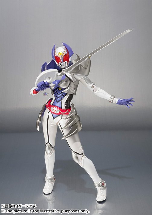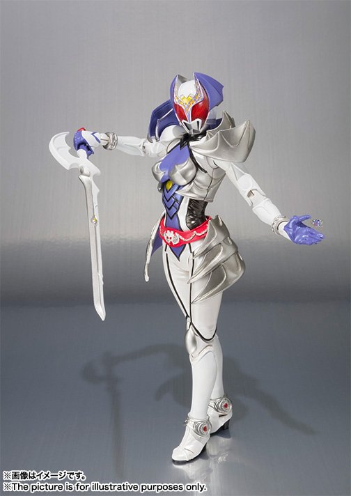 Kamen Rider Kiva-La appeared in the movie Movie Taisen 2010. Her transformation resulting from the use of the small white bat Kiva-La by the character Natsumi Hikari from the Kamen Rider Decade series. As in the movie, this S.H.Figuarts will have only its sword as weaponry. 13 cm height, this figure will be available on next September.