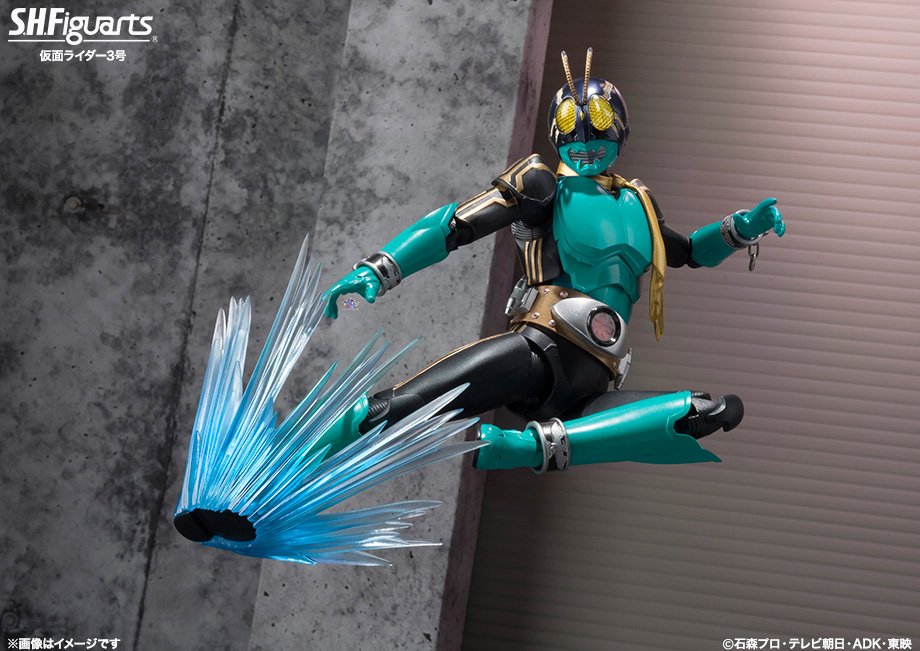 Kamen Rider Sango is the main character of the Super Hero Taisen GP movie which was released in last March in the Japanese theaters. In this movie, the story of Kamen Rider is rewritten and in this world the evil organization Shocker will create two more Rider after Ichigo and Nigo : Kamen Rider Sango and Yongo. In the original story of Kamen Rider and especially the first series started in 1971, the first motorcycle of heroes was called Cyclone. A first S.H.Figuarts of this motorcycle was already released in August 2013 and this new version is a remodeling. It will be released, as the figure of Kamen Rider Sango, in next October and will be also available for the occasion in a set with the figure of Kamen Rider Kyu Nigo (which is the character in his debuts appearance in the series).