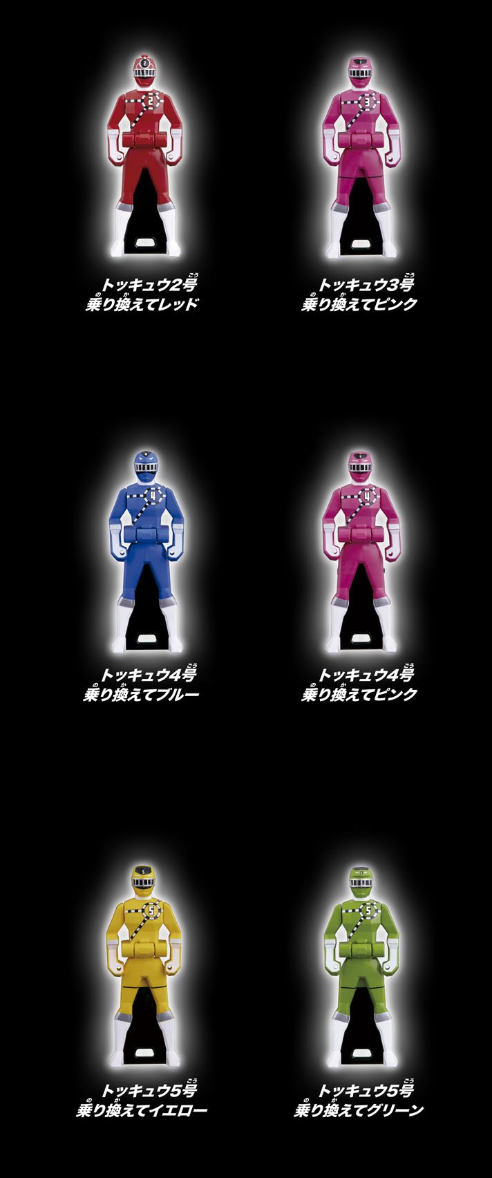 Avec l’ensemble des Ranger Key LOST EDITION nous avions l’annonce de Ranger Key liées à la série Ressha Sentai Toqger sans savoir si ce serait indépendant ou inclus dans l’ensemble LOST EDITION. Nous avons maintenant la réponse à ce mystère avec un ensemble de quarante Ranger Key entièrement dédié à Ressha Sentai Toqger. Ce nouvel ensemble regroupe les Ranger Key des sept Ranger présent dans la série et le film Kaettekita Ressha Sentai Toqger : Yume no Cho Toq 7gou ainsi qu’une majorité de leurs différents Norikae Change (dont ceux du film Ressha Sentai Toqger The Movie : Galaxy Line SOS). Sont présentes aussi plusieurs transformations exclusives de Toq 1gou dont « Yami no » et « Niji no ».