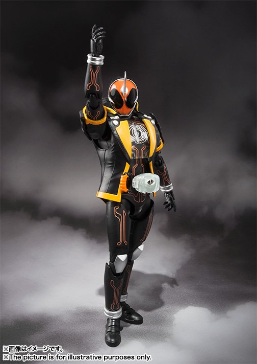 Après le salon Tamashii Nation 2015 où nous avions eu un stand entier de S.H.Figuarts de la série Kamen Rider Ghost voici quelques détails supplémentaires. La première figurine à sortir sera celle du héros en Ore Damashii (forme de base) accompagnée de Yurusen, le petit fantôme. Elle n’est cependant pas encore en précommande mais est déjà prévue pour être disponible en Avril prochain.