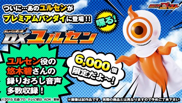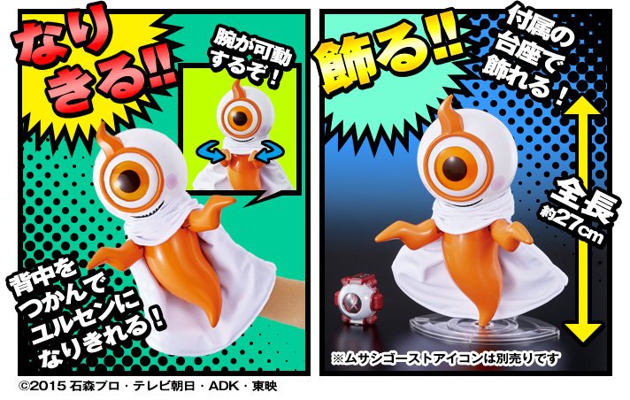 Après les deux ensembles de Ganma Eyecon, voici une nouvelle chose provenant de la franchise Kamen Rider Ghost en Premium Bandai. C’est Yurusen, le petit compagnon fantôme du héros, qui est à l’honneur et pour l’occasion le personnage est reproduit en une marionnette de 27 cm. Prévue pour une disponibilité en Mai prochain, cette marionnette sera articulée et dotée de fonctions sonores électroniques.