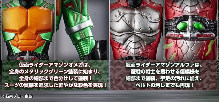Comme chaque série Kamen Rider qui se respecte, Kamen Rider Amazons a droit à ces figurines Rider Hero Series. Ce sont les deux héros principaux, Kamen Rider Amazon Alpha et Kamen Rider Amazon Omega, qui auront ces figurines de vinyle qui passeront directement par la case Premium Bandai. Avec ces Rider Hero Series EX de 18 cm disponibles pour Septembre prochain, les deux héros auront directement des figurines un minimum de bonne qualité sans passer par la qualité basique des figurines Rider Hero Series normales.