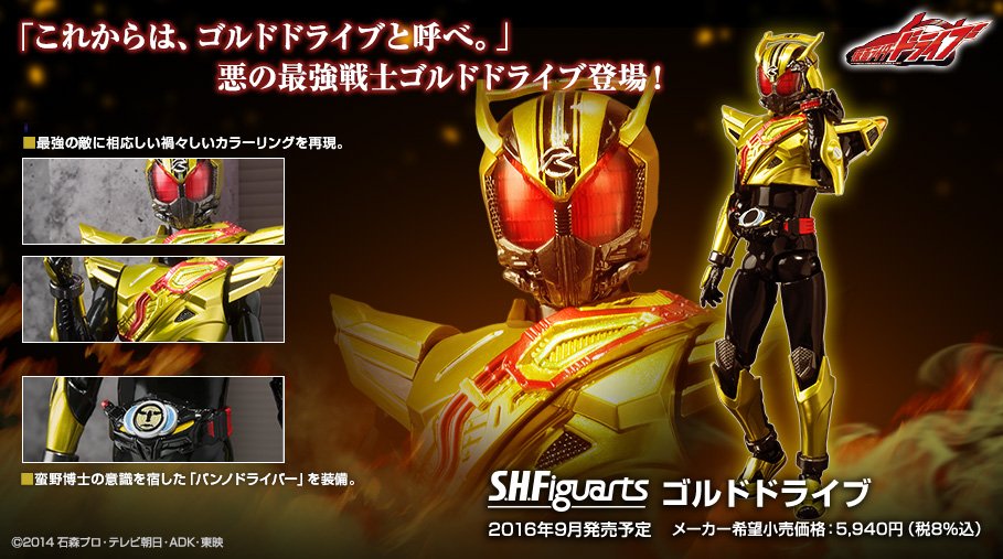 In the Kamen Rider Drive séries the creator of Roidmude is Tenjuro Banno. He is arrived at this with the help of Krim Steinbelt who was the creator of the Drive Driver who is the transformation device of the hero Kamen Rider Drive. Banno digitally converted his consciousness afterwards and later he copied the Drive Driver for transfer himself into it to become Gold Drive, using incidentally a Roidmude‘s body. It’s this version of Banno whose the appearance is, pretty much, the hero Kamen Rider Drive in Type Speed but in golden color which is now the subject of an S.H.Figuarts figure, 15 cm height, for an availability in next September.