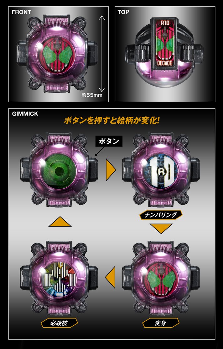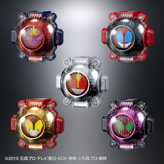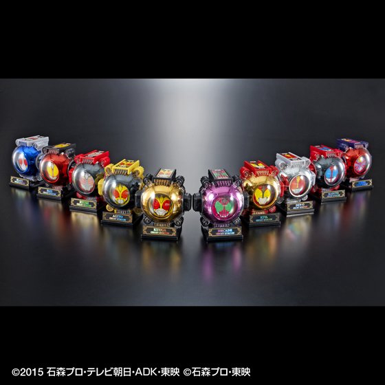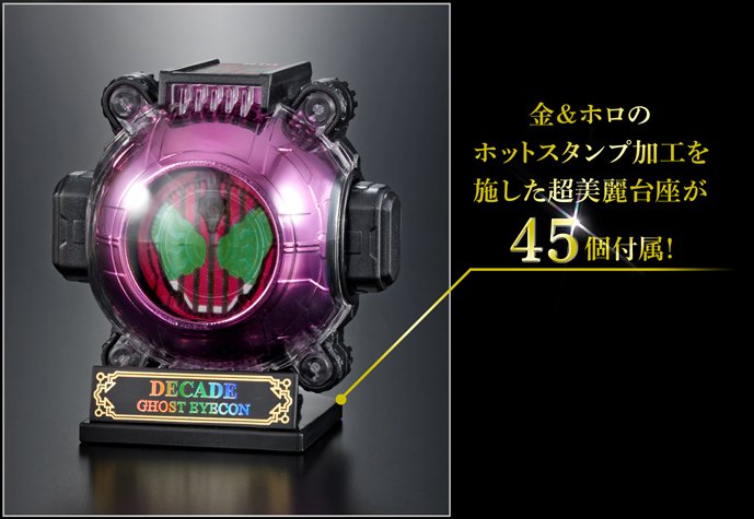 Premium Bandai nous proposait déjà un ensemble de Ghost Eyecon aux couleurs des héros Kamen Rider d’années précédentes (2000 à 2009) qui sont : Kuuga, Agito, Ryuki, Faiz, Blade, Hibiki, Kabuto, Den-O, Kiva et Decade. Cet ensemble nommé Legend Rider Ghost Eyecon était fournis avec dix socles correspondants à ces dix héros ainsi que six socles supplémentaires pour six autres héros qui étaient : Double, OOO, Fourze, Wizard, Gaim et Drive, dont les Ghost Eyecon étaient disponibles séparément de cet ensemble. Décidément toujours dans l’originalité, Bandai nous propose maintenant exactement le même ensemble mais en version brillante nommé Legend Rider Ghost Eyecon Kirakiramekki Version. Ce sont donc les mêmes Eyecon mais avec le rajout d’un revêtement brillant métallisé et d’une stylisation différente des noms sur les socles. Cet ensemble Kirakiramekki sera disponible en Septembre prochain.