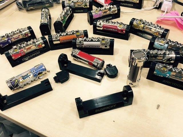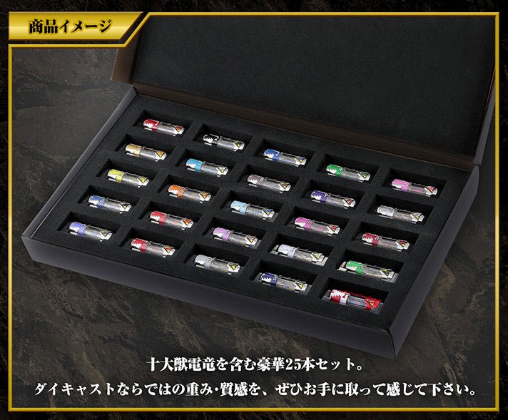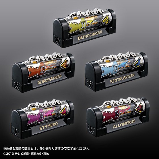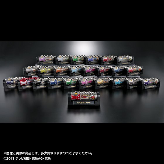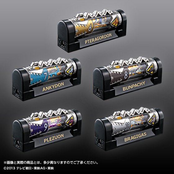 Dans la série Zyuden Sentai Kyoryuger la puissance des héros venait de petits objets entre cartouche et pile : les Zyudenchi. Chacune à l’effigie d’un dinosaure, elles reviennent dans une nouvelle version en métal. L’ensemble regroupera les vingt-trois Zyudenchi principales avec ajout de Tobaspino et de la Zyudenchi Gabutyra spéciale permettant à Kyoryu Red d’avoir la forme Carnival. Cet ensemble Die-Cast Zyudenchi sera disponible en Septembre prochain via le site Japonais de Premium Bandai.