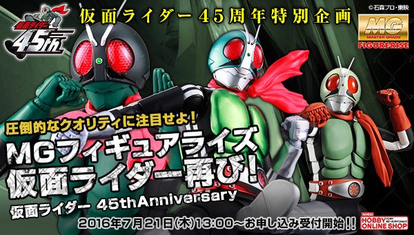 Always for the 45 years of the Kamen Rider franchise, Bandai offers us the reissue of heroes’ models released under the range MG (Master Grade) FIGURE-RISE. Under this range constituted of models of 20 cm height to assemble yourself we have here the reissues of models of Kamen Rider Shin Ichigo (but here for him with a new glossy coating), Kamen Rider Shin Nigo, Kamen Rider Ichigo Sakurajima and Kamen Rider Kyu Ichigo. These reissues of these four MG FIGURE-RISE models will be availables in next October and November.