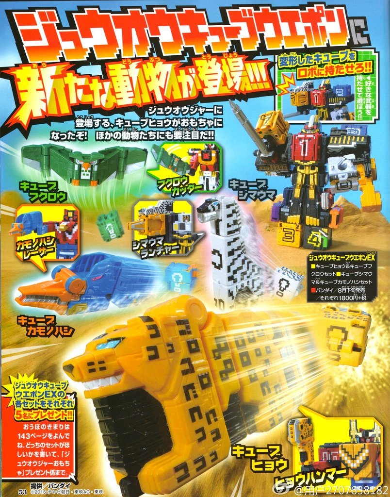 Cube Hyou will turn into the Hyou Hammer, Cube Fukurou will turn into the Fukurou Cutter, Cube Shimauma will turn into the Shimauma Launcher and Cube Kamonohashi will turn into the Kamonohashi Laser.