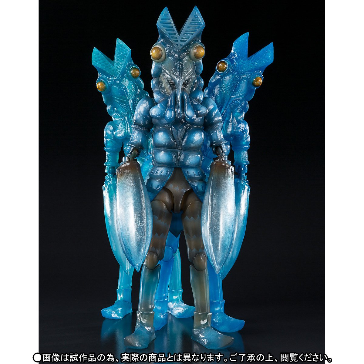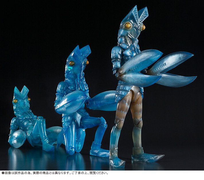 Baltan Seijin est un ennemi d’Ultraman apparu dans la série débutée en Juillet 1966. L’appellation de cet adversaire peut se traduire par extraterrestre Baltan, créature provenant d’une planète du même nom. Cette planète fut détruite, forçant les survivants à errer dans l’espace jusqu’à venir sur la Terre dont les ressources furent très appropriées à leurs besoins et cherchèrent à la conquérir. Malheureusement pour eux, ils trouvèrent un autre extraterrestre, le héros Ultraman, sur leur chemin pour les en empêcher. Ce nouvel ensemble S.H.Figuarts vient après une première figurine de cet ennemi sortie en Août dernier. Ce nouveau trio de figurines de 16 cm prévu pour Avril prochain représente son pouvoir de clonage par effet résiduel de son déplacement dans l’espace.