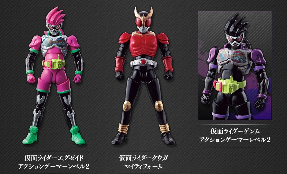 Almost two months after some first pictures, here is again the FULL ACTION FIGURE SAGA. Besides the apparent purpose which is to have a fully articulated figure for an cheap price (500 yen), we have the first three figures that will inaugurate this new range in February : Kamen Rider Ex-Aid Action Gamer Level 2 (already unveiled two months ago), Kamen Rider Kuuga Mighty Form and Kamen Rider Genm Action Gamer Level 2.