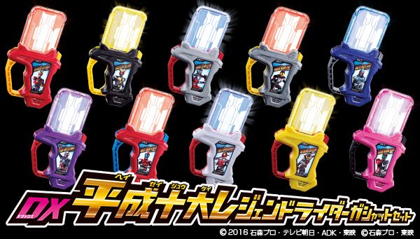Comme chaque année, une majorité des Kamen Rider font l’objet d’une adaptation de l’objet à collectionner du héros actuel. Cette année c’est donc Kamen Rider Ex-Aid et ses Gashat qui sont aux couleurs de quelques héros des années précédentes. C’est tout un ensemble qui sortira en Mars prochain et il regroupera les dix Kamen Rider principaux et titres de leurs propres séries de 2000 à 2009 qui sont : Kuuga, Agito, Ryuki, Faiz, Blade, Hibiki, Kabuto, Den-O, Kiva et Decade. Ces Legend Rider Gashat seront bien sûr électroniques et comme dans la série inspirés jeux vidéo et donc nommés dans ce style : Adventure Guy Kuuga, Agito of the Sun, Mirror Labyrinth Ryuki, Moshi Moshi Faiz, King of Poker Blade, Taiki Master Hibiki, Insect Wars Kabuto, Time Express Den-O, Doki Doki Makai Castle Kiva et Barcode Warrior Decade.