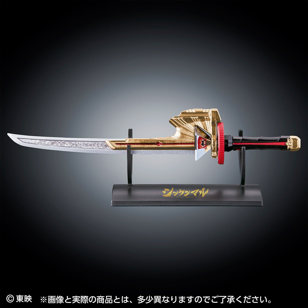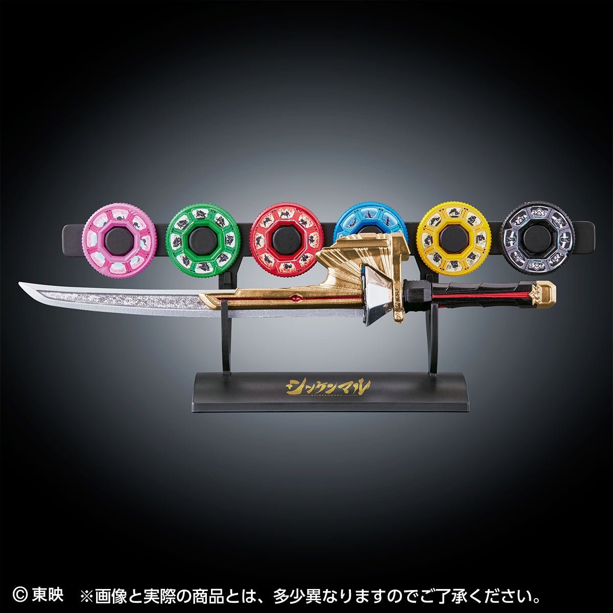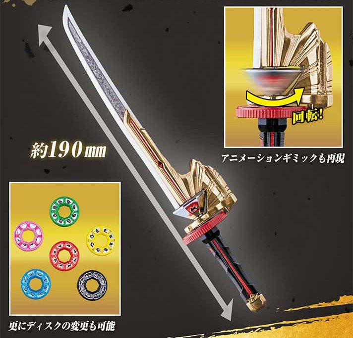 La gamme High Proportion Collection (HPC) est une gamme de miniatures d’armes de héros de séries Super Sentai et Kamen Rider. Cette gamme est notamment liée à Premium Bandai et c’est l’arme des cinq héros principaux d’une série Super Sentai qui est maintenant à l’honneur : le Shinkenmaru ! Ce sabre provient de la série Samurai Sentai Shinkenger et se voit ici reproduit et rapetissé à la taille de 19 cm de long. Cet High Proportion Collection EX Shinkenmaru sera disponible en Juin prochain et, en plus d’un présentoir, disposera des cinq Hiden Disk principaux Shishi, Ryu, Kuma, Kame et Saru des héros Shinken Red, Blue, Green, Pink et Yellow et également le Kyotsu, l’Hiden Disk commun de l’arme.