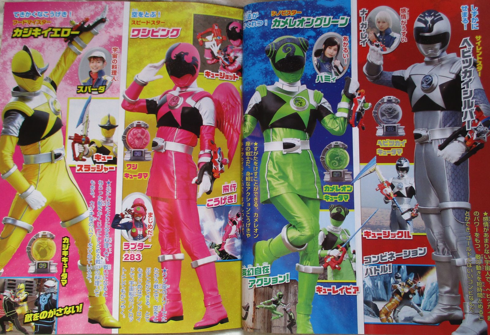 By sliding the sphere of their Kyutama (this process is called « mawaslide » (mawasu, turn + slide)) and setting them in their Seiza Blaster, the Kyurangers will transform by shouting « Star Change » !