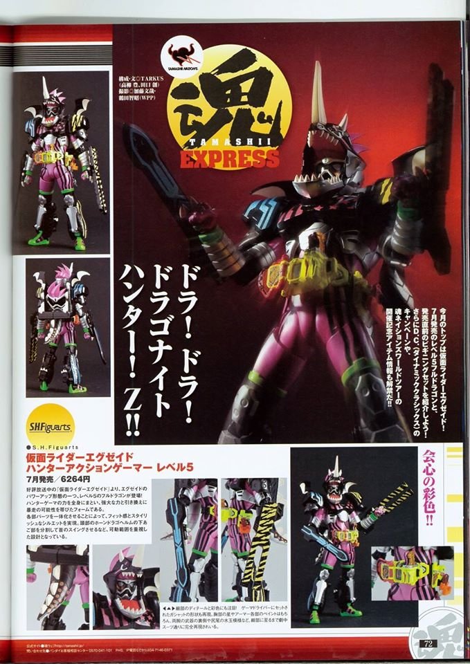 Here is a new form of Kamen Rider Ex-Aid in S.H.Figuarts. Planned for an availability in next July, this new figure represents the hero in Hunter Action Gamer Level 5, form which he gets by using the Drago Knight Hunter Z Gashat in his Gamer Driver. At the same time, here are the reissues of the S.H.Figuarts of the heroes Kamen Rider Kick Hopper and Kamen Rider Punch Hopper scheduled for next August and September. Like the figures of Kamen Rider Kabuto and Kamen Rider Gatack before them, these new S.H.Figuarts of the two heroes will be reshaped to be closer to the characters of whose they are the effigy than the old versions. We are also learning the upcoming release of a COMPLETE SELECTION MODIFICATION edition of the Hopper Zecter, the common transformation device to Kick Hopper and Punch Hopper, but without any pictures yet.