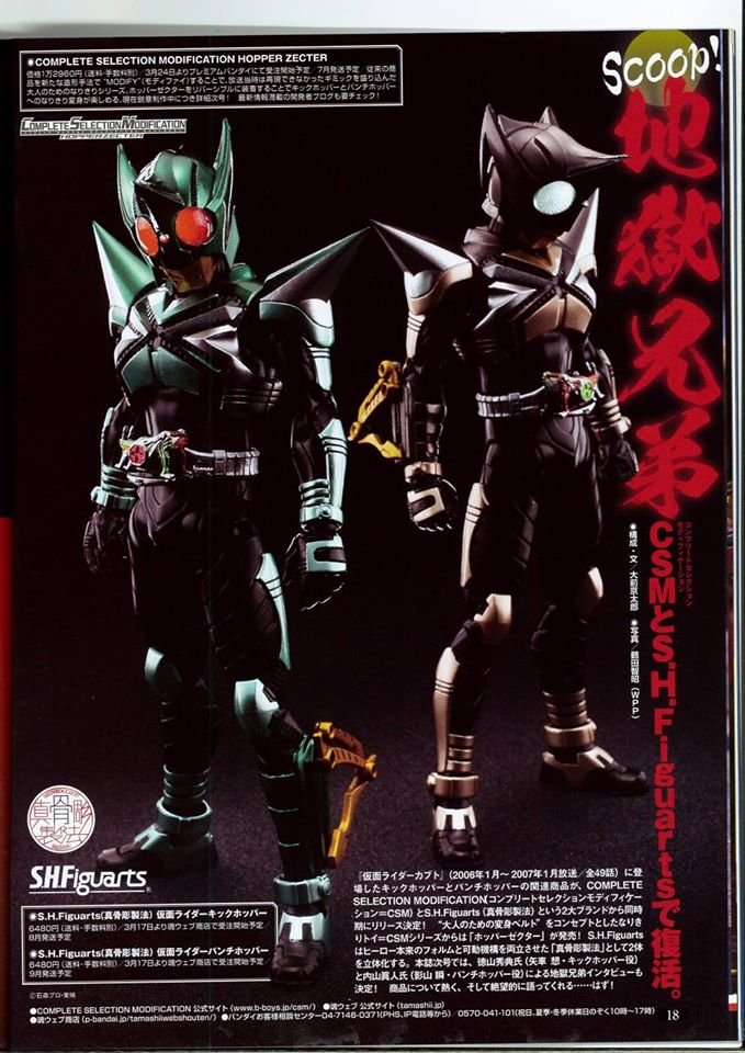 Voici une nouvelle forme de Kamen Rider Ex-Aid en S.H.Figuarts. Prévue pour une disponibilité en Juillet prochain, cette nouvelle figurine représente le héros en Hunter Action Gamer Level 5, forme qu’il obtient en utilisant le Gashat Drago Knight Hunter Z dans son Gamer Driver. Parallèlement, voici les rééditions des S.H.Figuarts des héros Kamen Rider Kick Hopper et Kamen Rider Punch Hopper prévues pour Août et Septembre prochains. Comme les figurines de Kamen Rider Kabuto et Kamen Rider Gatack avant elles, ces nouvelles S.H.Figuarts des deux héros seront refaçonnées pour être plus proche des personnages dont elles sont l’effigie que les anciennes versions. Nous apprenons également la sortie prochaine d’une édition COMPLETE SELECTION MODIFICATION du Hopper Zecter, appareil de transformation commun a Kick Hopper et Punch Hopper, mais sans images pour le moment.