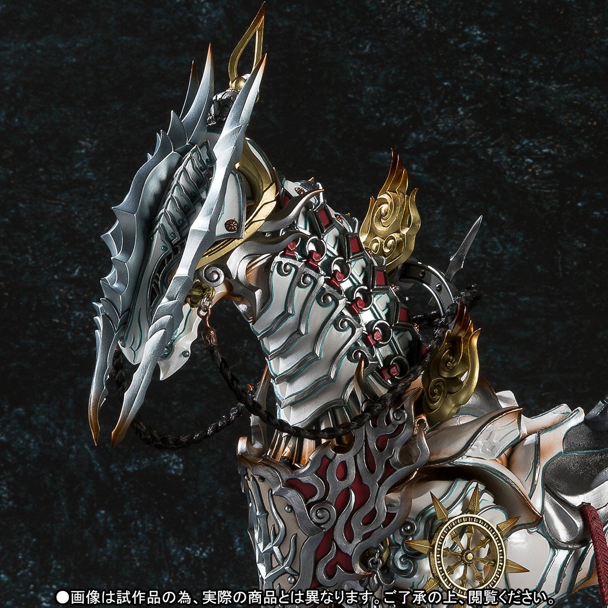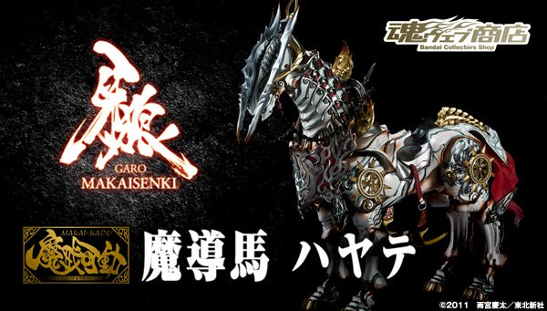 Hayate is the personal mount of the Byakuya Kishi Dan, hero from the Garo franchise. Dan, whose real name is Tsubasa Yamagatana, is a Makai knight who appeared for the first time in the Garo Byakuya no Maju TV movie. The knight will return later in the Garo Makai Senki series and this series will see the first appearance of his horse, Hayate. A figure from the MAKAI-KADO range that will be released in next April will be at the effigy of the Byakuya Kishi Dan and Hayate will join the same range in next August.