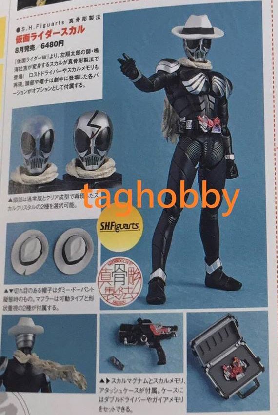 Kamen Rider Skull est un héros provenant de la franchise Kamen Rider W. Le personnage avait déjà connu deux éditions différentes en figurines dans la gamme S.H.Figuarts en 2010 et en 2011. Voici maintenant une troisième version qui sera disponible en Août prochain avec une apparence plus proche du personnage et plus d’accessoires. Le même mois sortira en S.H.Figuarts également un autre Kamen Rider noir mais quant à lui provenant du film de la série Kamen Rider Drive qui est Kamen Rider Dark Drive, principal antagoniste de cette aventure du héros.