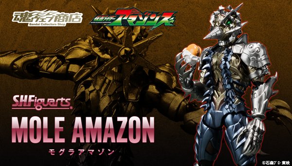After the S.H.Figuarts of the three Kamen Rider (Amazon Alpha, Amazon Omega and Amazon Sigma) from the first season of the Kamen Rider Amazons series, here is a figure of another hero from the series : Mogura Amazon ! Available in next October via the Japanese website of Bandai Collectors Shop, this S.H.Figuarts of Mogura Amazon of 15 cm tall will be sold with the necessary to simulate the piercing of a body.
