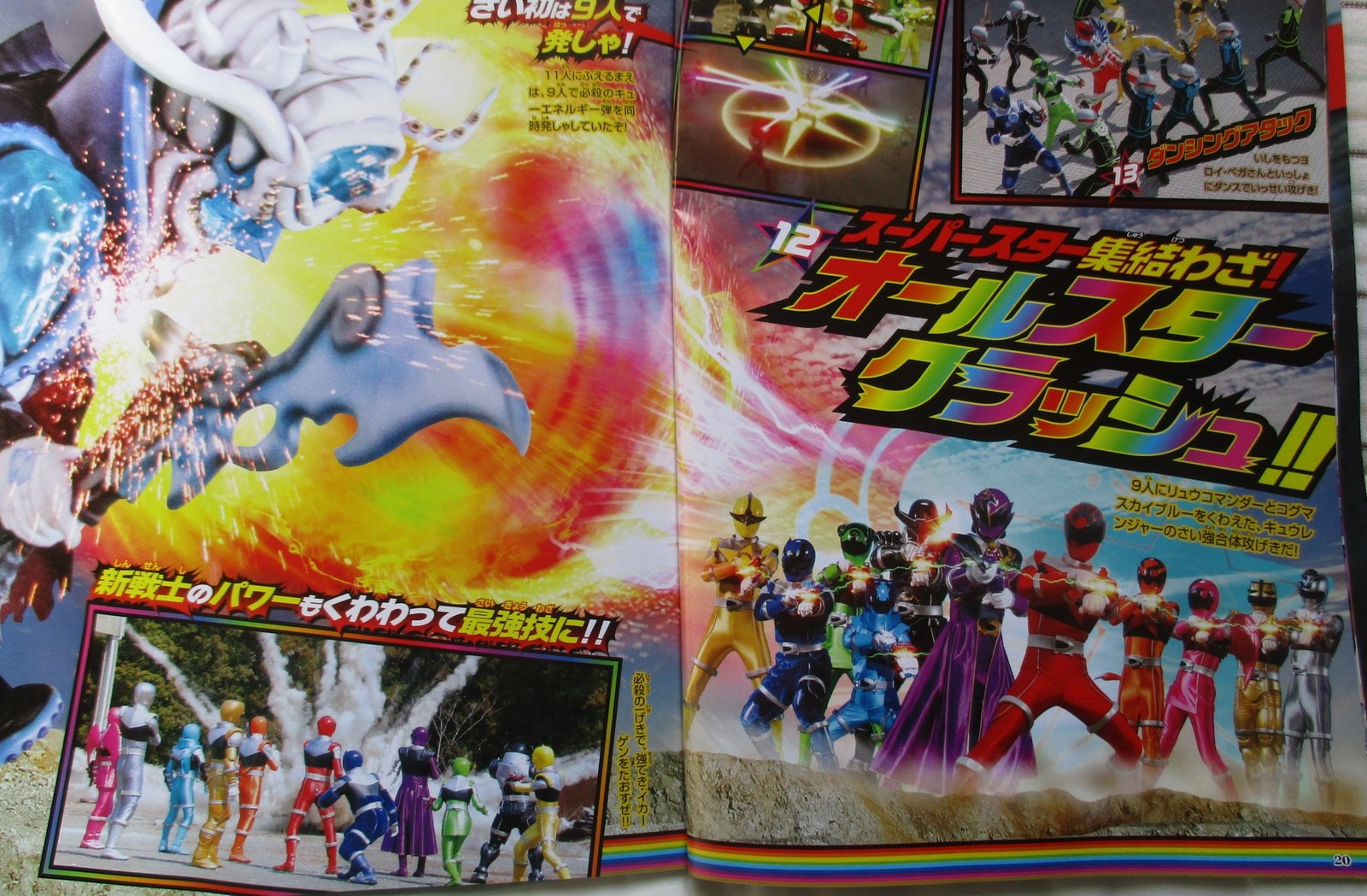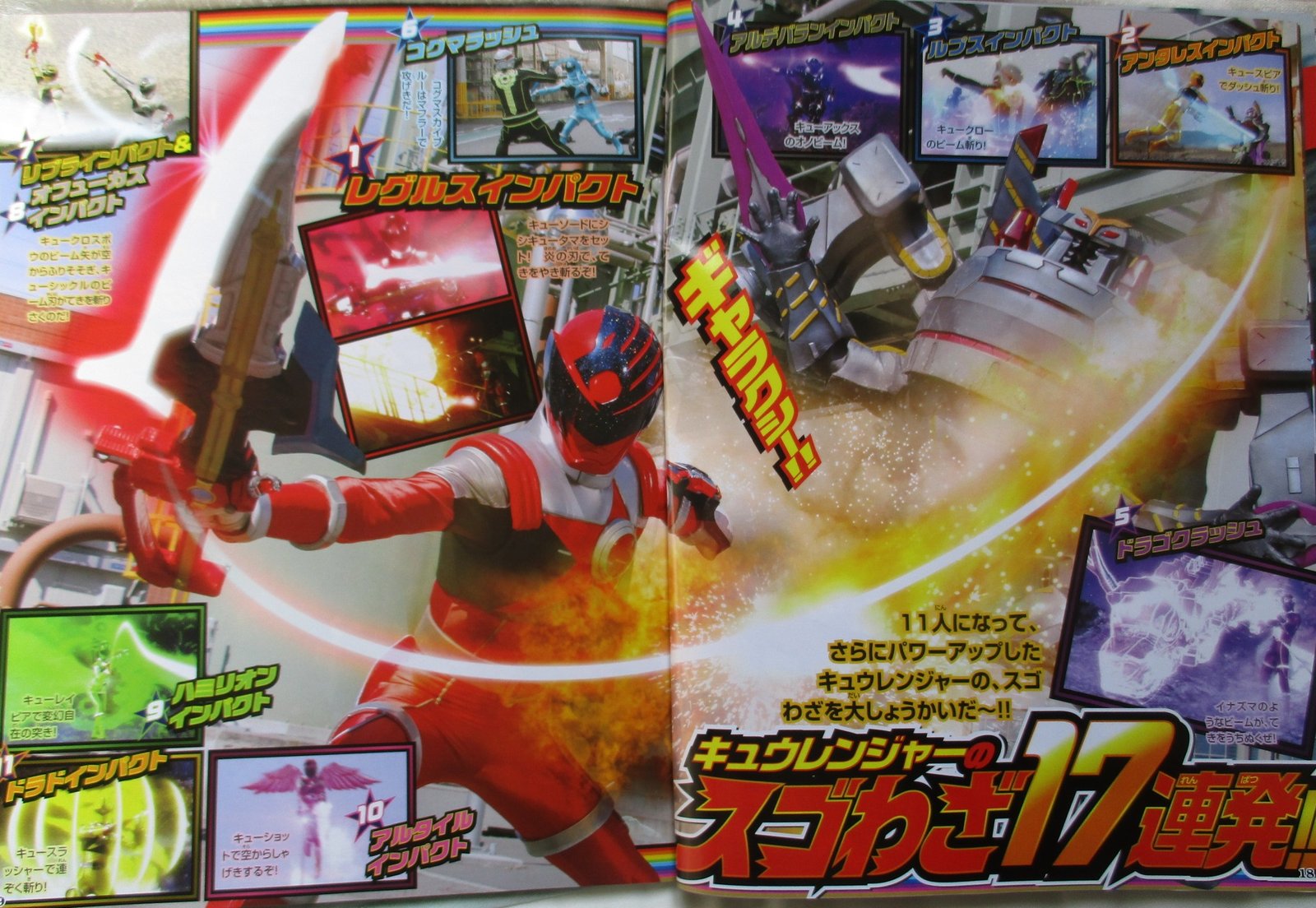 Nous en avons déjà vues quelques unes dans la série mais voici les attaques spéciales de chaque Kyuranger. Nous voyons aussi leur attaque ultime à 11, le All Star Crush.