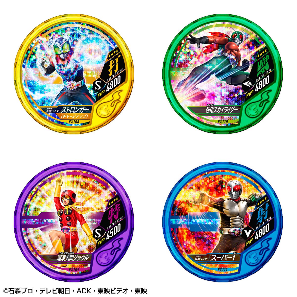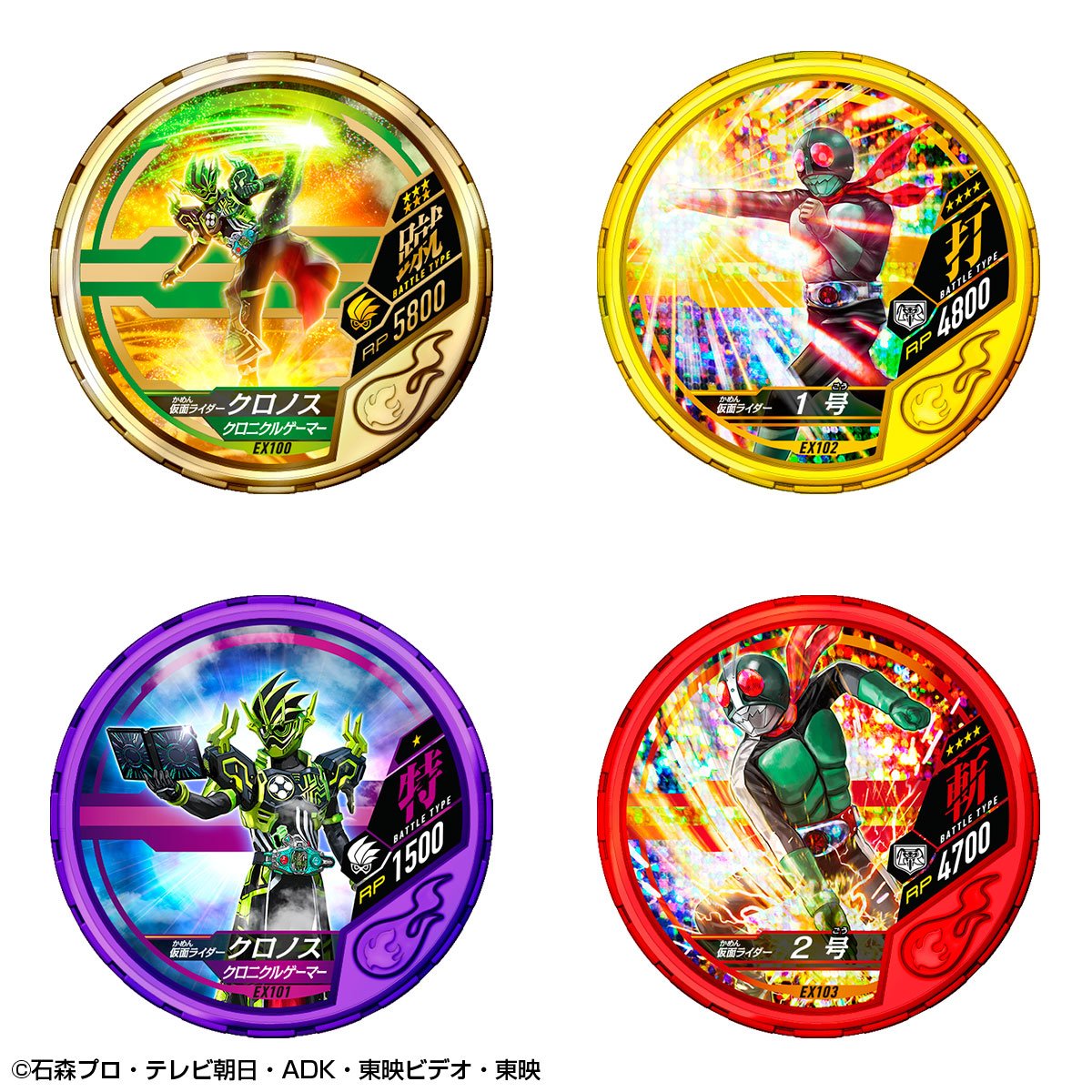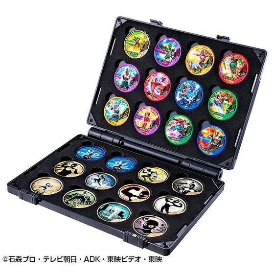 Buttobasoul is, in Japan, a video game about the Kamen Rider franchise on arcade machine. The game operates via tokens at the effigy of heroes and their different forms and attacks. This is a set of tokens in part based on the Kamen Rider Ex-Aid series and old heroes from between 1971 and 1981 which is marketed here by Premium Bandai. Available in next November, the tokens will represent so in majority several characters who will be : Cronus, Ichigo, Nigo, V3, Riderman, X, Amazon, Stronger, Denpa Ningen Tackle, Skyrider and Super 1. The rest of the set will be constitued mainly of attack tokens and the whole will be grouped in a container of the same model of Medal Holder as the one used for the various O-Medal from the Kamen Rider OOO series but with obviously different motifs on both sides. Note that the publication of this set is accompanied by an announcement for another one whose some more informations are scheduled for next September.