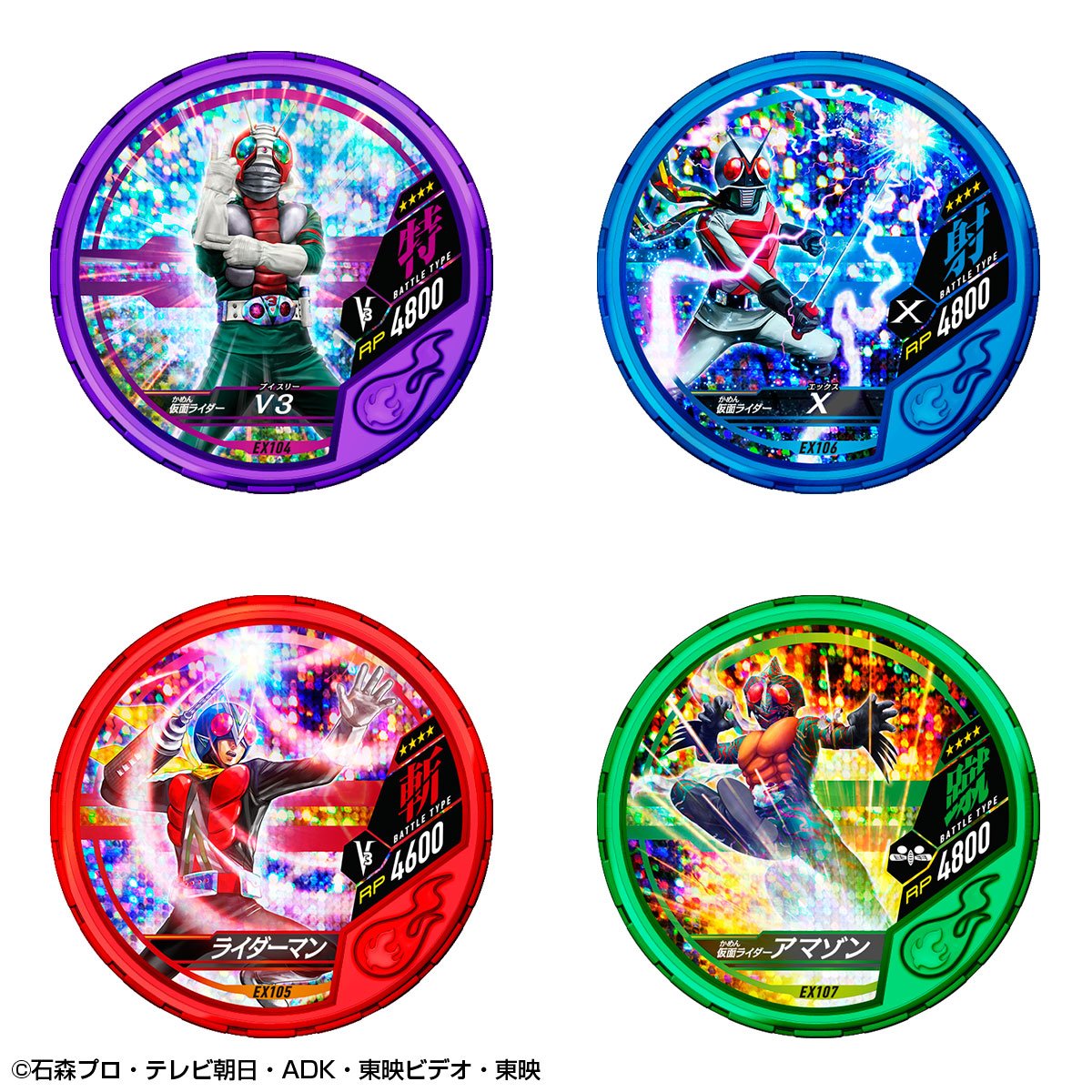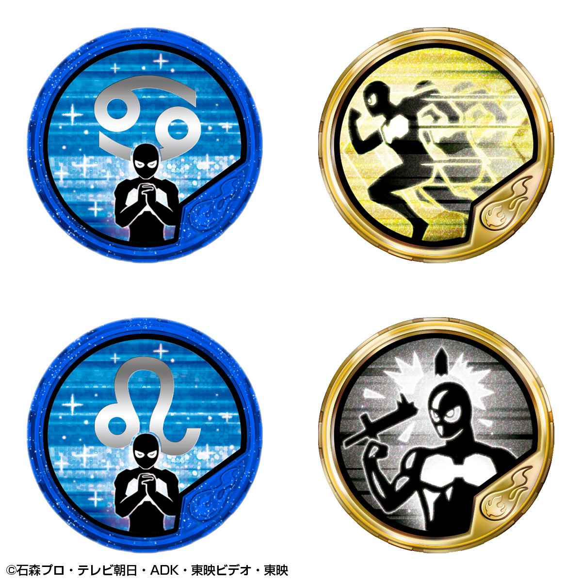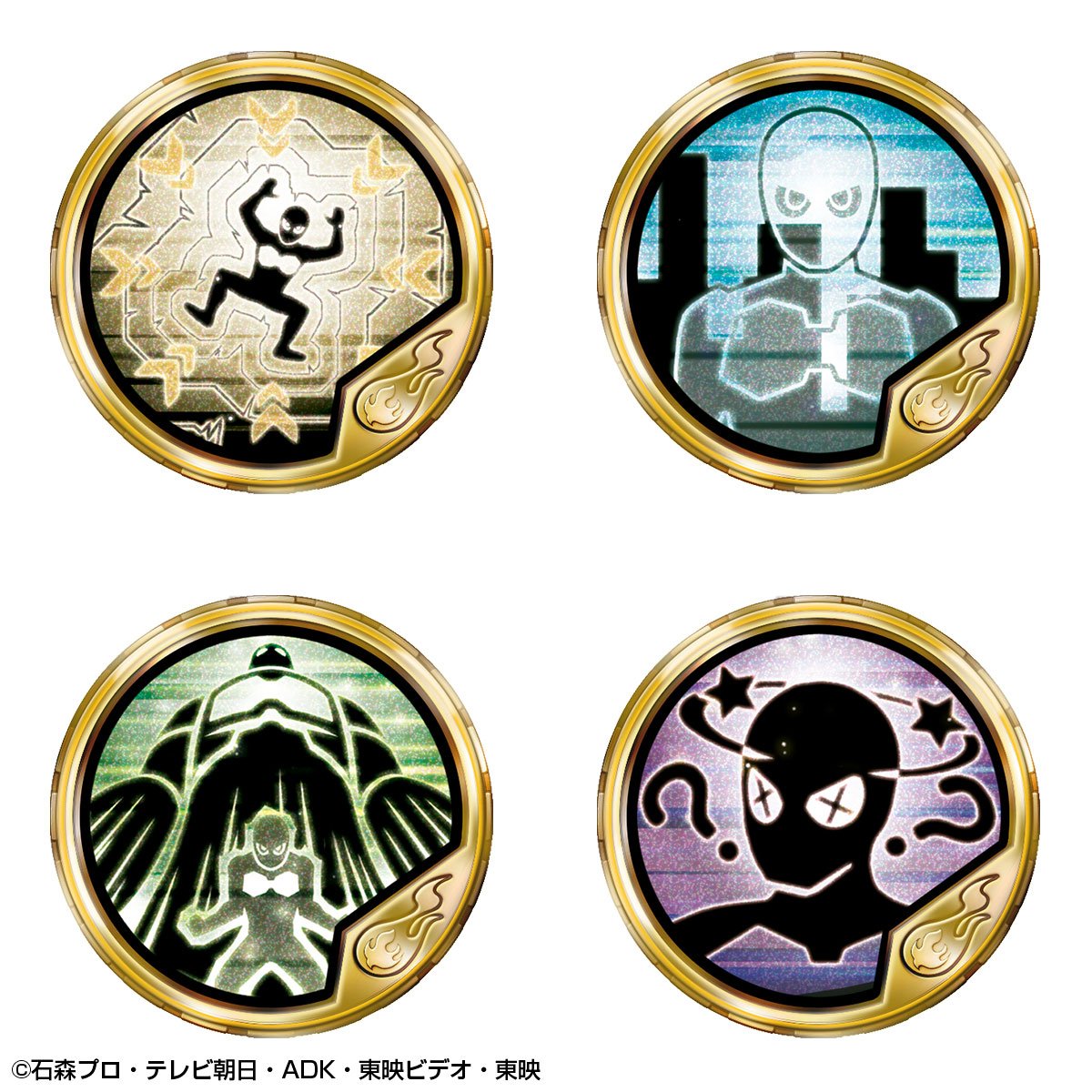 Buttobasoul is, in Japan, a video game about the Kamen Rider franchise on arcade machine. The game operates via tokens at the effigy of heroes and their different forms and attacks. This is a set of tokens in part based on the Kamen Rider Ex-Aid series and old heroes from between 1971 and 1981 which is marketed here by Premium Bandai. Available in next November, the tokens will represent so in majority several characters who will be : Cronus, Ichigo, Nigo, V3, Riderman, X, Amazon, Stronger, Denpa Ningen Tackle, Skyrider and Super 1. The rest of the set will be constitued mainly of attack tokens and the whole will be grouped in a container of the same model of Medal Holder as the one used for the various O-Medal from the Kamen Rider OOO series but with obviously different motifs on both sides. Note that the publication of this set is accompanied by an announcement for another one whose some more informations are scheduled for next September.