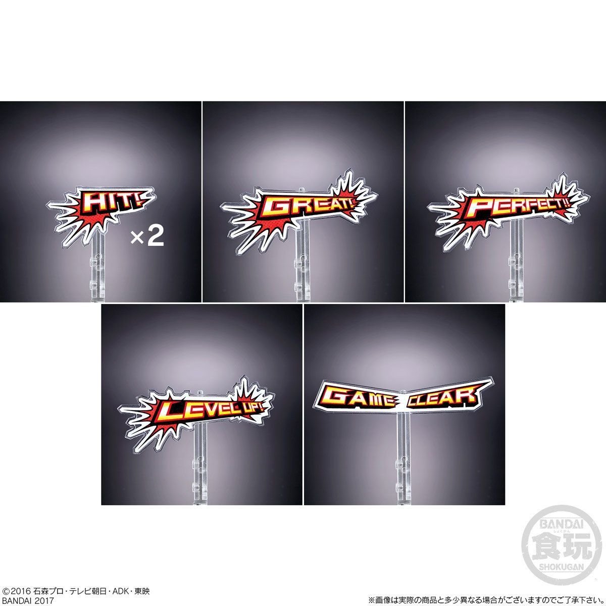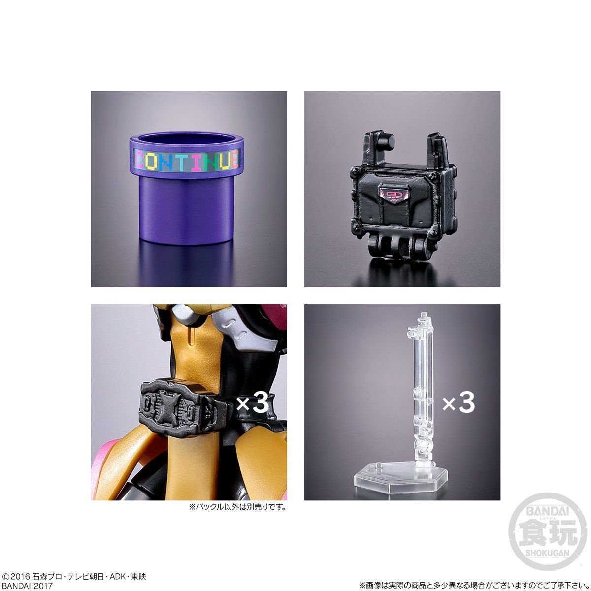 SO-DO est une gamme de figurines Candy Toy (les jouets avec le bonbon en cadeau) de 10 cm de haut en moyenne. Voici un nouvel ensemble spécial Kamen Rider Ex-Aid qui sera disponible en Décembre prochain via Premium Bandai. Centré principalement sur la fin de la série, cet ensemble sera constitué de deux figurines représentant Game Deus Cronus et Ride Player Nico avec leurs accessoires respectifs qui seront accompagnées de six onomatopées de combat, trois Bugster Buckle, trois socles, une Gashat Case et du Continue Dokan de Kuroto Dan, un tube que le personnage utilise dans la série pour ressusciter, plus ou moins, à volonté.