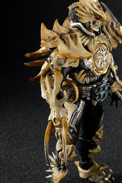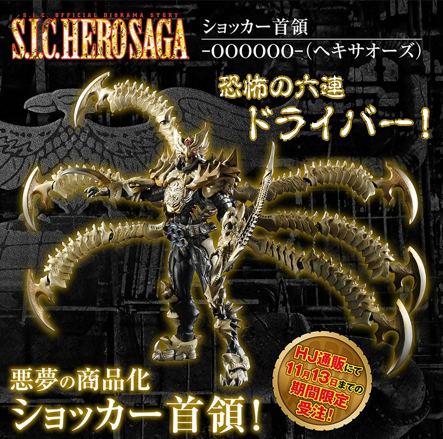 Que se passerait-il si le chef de Shocker, organisation historiquement ennemie des premiers héros Kamen Rider, obtenait les pouvoirs de Kamen Rider OOO ? Voici une réponse possible avec cette nouvelle S.I.C. de 19 cm. Cette figurine représente donc ce chef transformé en un Kamen Rider maléfique avec un OOOOOO (ou Hexa OOO) Driver où la différence notable avec le OOO Driver normal est le O-Slater avec six compartiments à O-Medal au lieu de trois. Pour cette transformation il utilise donc six Core Medal basées sur différentes itérations des organisations ennemies des héros de la première série de 1971 à Kamen Rider Stronger qui sont : Shocker, Gel Shocker, Deathtron, G.O.D. (= Government Of Darkness), Garander Teikoku et Delzer Gundan. Cette S.I.C. de Shocker Shuryo OOOOOO sera disponible en Avril prochain.