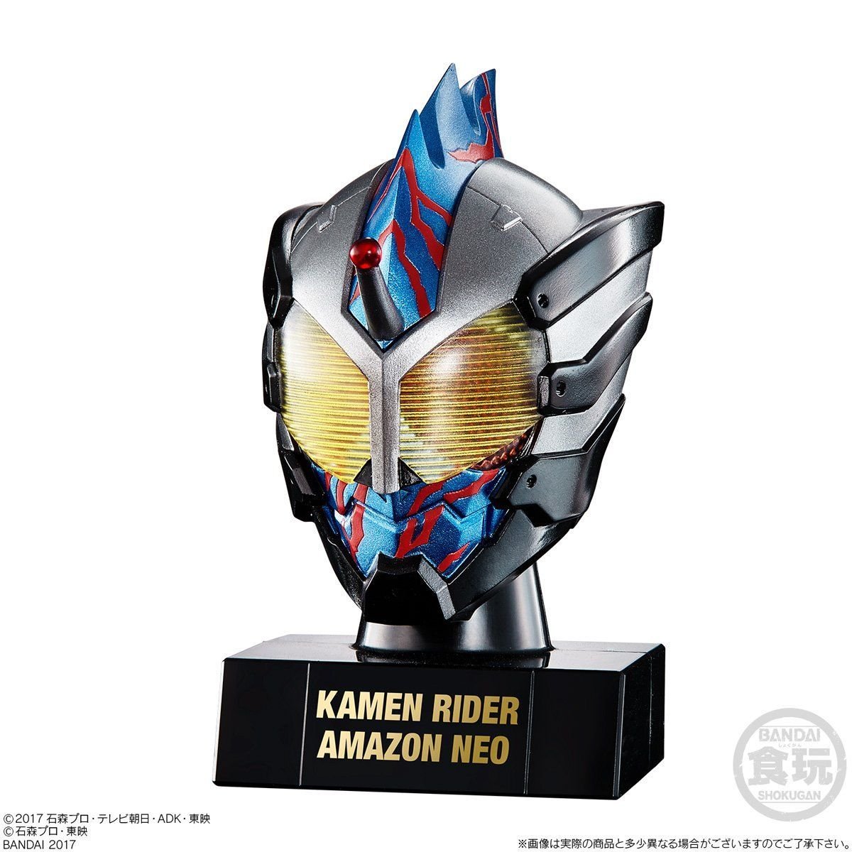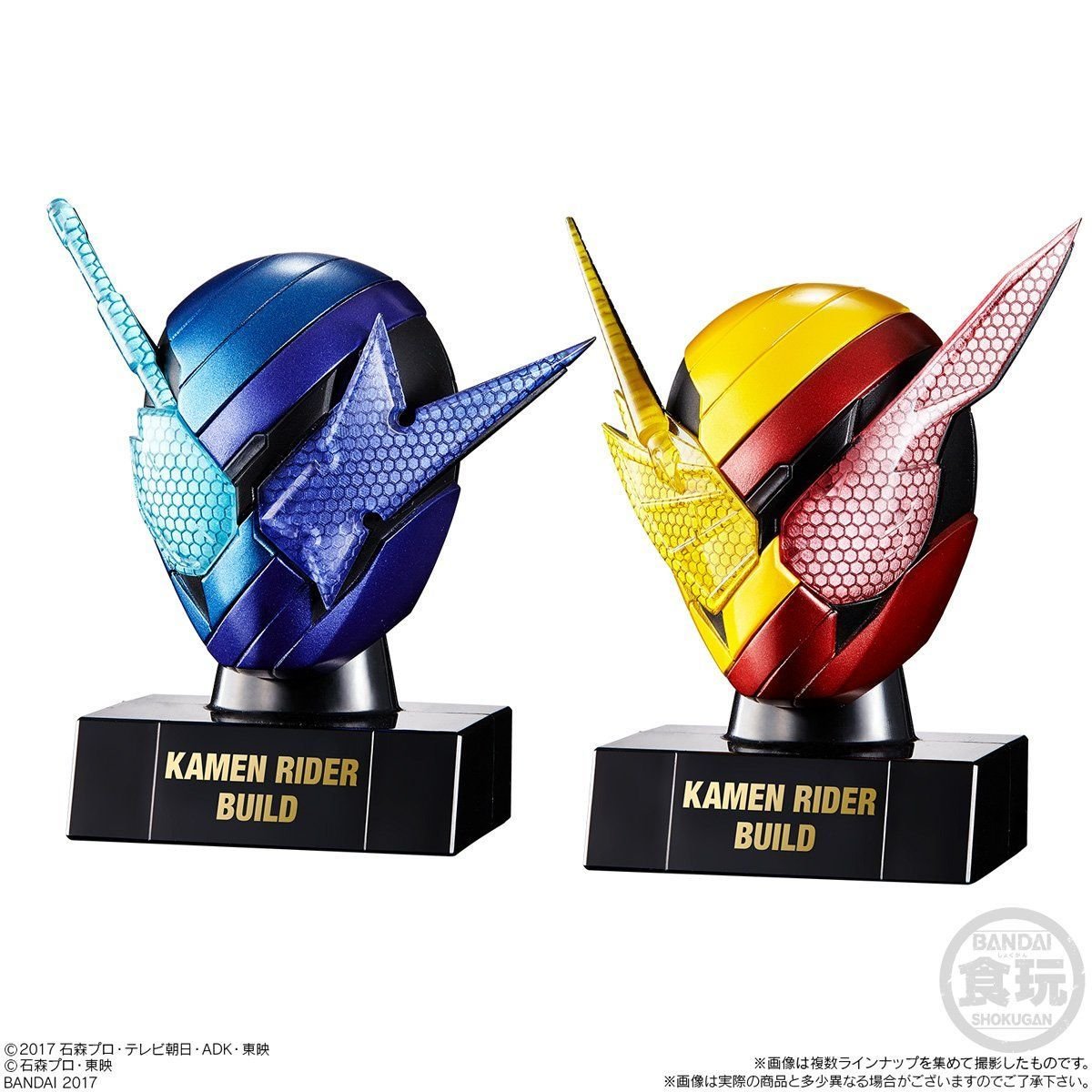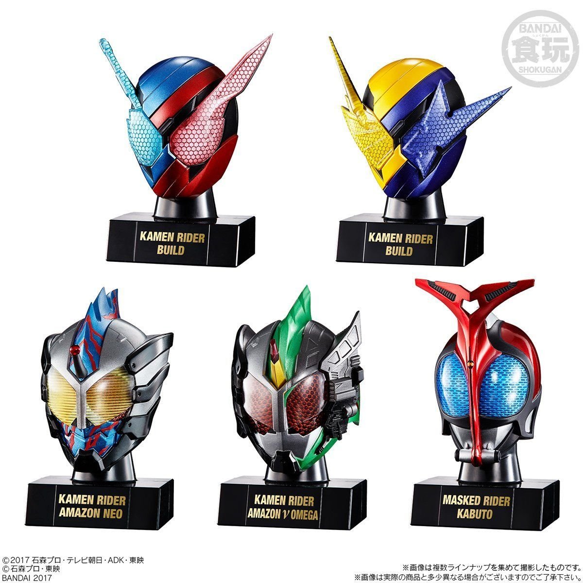 Here’s a new set in the range of shrunken heads of less than 10 cm of Kamen Rider heroes’ helmets named Kamen no Sekai/Masker World. This range will host in next September five new helmets from some Kamen Rider heroes who will be : Build Rabbit Tank Form, Build Ninnin Comic Form, Amazon Neo, Amazon Nu Omega and Kabuto Rider Form. This set will be sold on the same principle as the Candy Toy products. In this case, these five helmets will be sold in a set of ten where there will be at least one helmet of each but the remaining five copies will be randomly distributed per copies of this set. It should also be noted that in the case of the two helmets of Kamen Rider Build, they will be able to disassemble and interchange their sides, giving the possibility to make the Rabbit Comic Form and the Ninnin Tank Form.