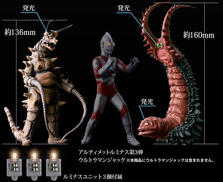 Après plusieurs monstres de la franchise Ultraman, voici de nouveaux venus dans la gamme Ultimate Luminous. Ces nouvelles statuettes représenteront les créatures Gudon et Twintail, adversaires géants du héros Ultraman Jack apparus en 1971 dans la série Kaettekita Ultraman. Comme leurs prédécesseurs dans la même gamme, Gudon et Twintail de cet ensemble Ultimate Luminous prévu pour Mars prochain posséderont des fonctions lumineuses aux yeux (et aussi à la queue pour Twintail) alimentées par piles (non incluses).