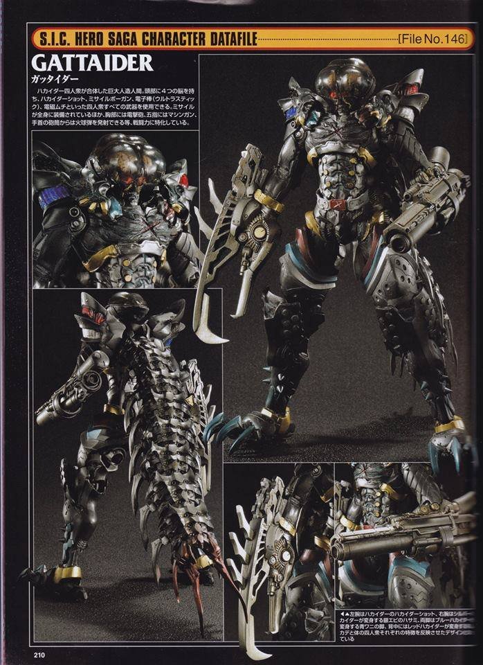 Here are two upcoming S.I.C. and S.H.Figuarts figures. The first figure, the S.I.C., will be the Gattaider, assembly of the all four members of the Hakaider Butai from the Kikaider 01 series by assimilation of Red, Blue and Silver by their leader, Gill. The second figure, the S.H.Figuarts, so will be Night Rogue, one of the antagonists from the Kamen Rider Build series, of which we already had some pictures.