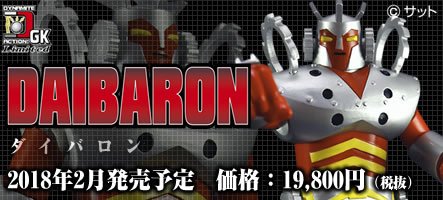 Le Daibaron est le robot de la série Chisana Superman Ganbaron de 1977 et troisième série de la même franchise télévisuelle que les séries Super Robot Red Baron et Super Robot Mach Baron diffusées entre 1973 et 1975. Cette série suit le jeune héros Ganbaron contre divers menaces dont certaines géantes, contre lesquelles il utilise son puissant robot nommé Daibaron, composé du Hirider, un véhicule volant et du Bakushin, un véhicule terrestre. Une fois Daibaron formé, Ganbaron entre dans l’abdomen du robot avec la Toboon, sa navette personnelle, dans une cavité prévue à cet effet et pilote ainsi la machine contre les monstres géants. La marque Evolution Toy sortira en Février prochain dans sa gamme Dynamite Action GK Limited une figurine du Daibaron de 17 cm avec comme accessoires plusieurs mains interchangeables et les trois véhicules Toboon, Hirider et Bakushin (mais non transformables, comme la figurine).