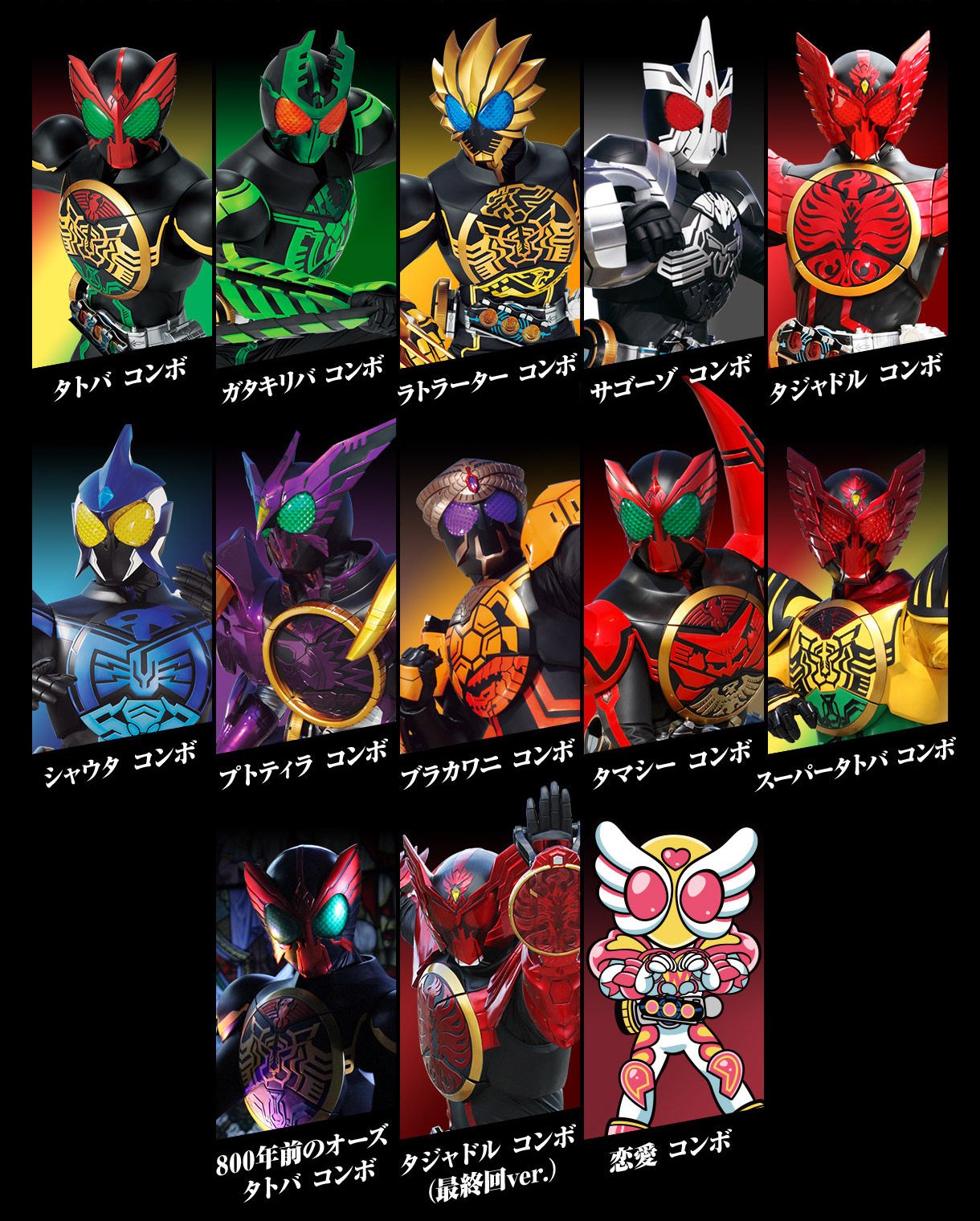 Quarante-sept des cinquante-neuf O-Medal présentes dans l’ensemble complet sont : Taka (faucon), Kujaku (paon), Condor, Kuwagata (lucane cerf-volant), Kamakiri (mante religieuse), Batta (sauterelle), Lion, Tora (tigre), Cheetah (guépard), Sai (rhinocéros), Gorilla (gorille), Zo (éléphant), Shachi (orque), Unagi (anguille électrique), Tako (poulpe), Ptera (ptéranodon), Tricera (tricératops), Tyranno (tyrannosaure), Cobra, Kame (tortue), Wani (crocodile), Super Taka, Super Tora, Super Batta, Imagin, Shocker, Same (requin), Kujira (baleine), Ookamiuo (poisson loup), Kamen Rider X, Kamen Rider Amazon, Kamen Rider Stronger, Kangaroo (kangourou), Panda, Yadokari (bernard l’hermite), Shika (cerf), Gazelle, Ushi (taureau), Seiuchi (morse), Shirokuma (ours polaire), Penguin (manchot), Mukade (centipède), Hachi (abeille), Ari (fourmi), Ebi (crevette), Kani (crabe) et Sasori (scorpion). Pour les douze O-Medal restantes, les versions noires de Ebi, Kani et Sasori proviennent du film Kamen Rider x Kamen Rider OOO & Double Feat. Skull : Movie Taisen Core de 2010, les versions avec le contour argenté de Tora, Taka, Kujaku, Condor, Kuwagata, Kamakiri et Batta proviennent du film Kamen Rider Heisei Generations Final : Build & Ex-Aid with Legend Rider de 2017 et les versions fissurée et cassée de Taka proviennent de la fin de la série Kamen Rider OOO.