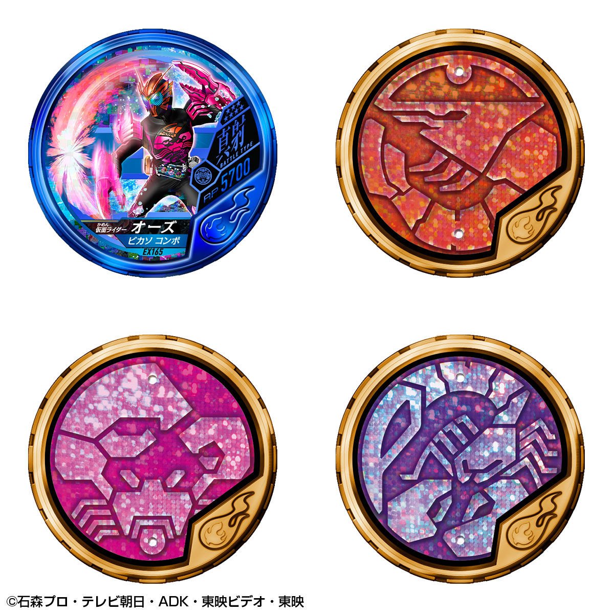 Buttobasoul is, in Japan, a video game about the Kamen Rider franchise on arcade machine. The game operates via tokens at the effigy of heroes and their different forms and attacks. This is a set of tokens in part based on the Kamen Rider OOO licence which is marketed here by Premium Bandai. Available in next June, these tokens will represent in majority several Core Medal, whose certains had never been used so far in the series and movies related to Kamen Rider OOO, will be : Ebi (versions colorful and black), Kani (versions colorful and black), Sasori (versions colorful and black), Shika, Gazelle, Ushi, Mukade, Hachi, Ari, Seiuchi, Shirokuma, Penguin, Same, Kujira, Ookamiuo, Yadokari, Cobra, Kame and Wani. The rest of the set will be constitued of five attack tokens at effigy of five new Combo which are : BiKaSo, ShiGazeShi, MukaShiRi, SeiShiroGuin and SaRaMiuo. The whole will be grouped in a container of the same model of Medal Holder as the one used for the various O-Medal in the Kamen Rider OOO series with the same motif on one side but different on the other side with an part of the Ankh’s Taka Medal broken at the end of the series.