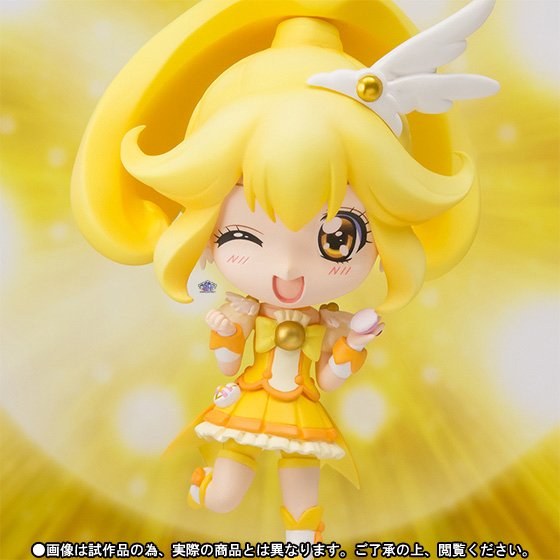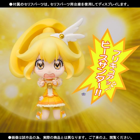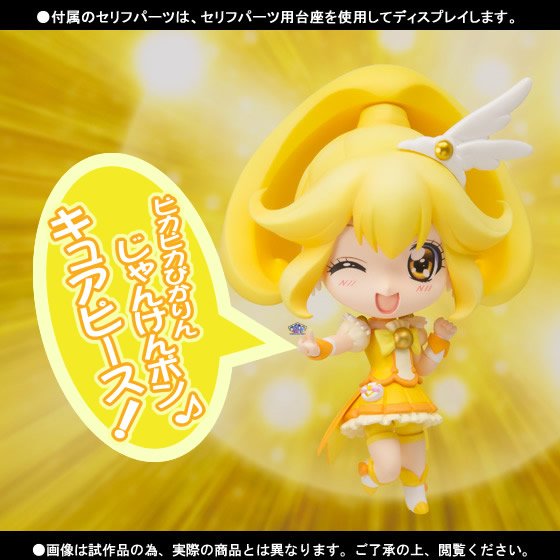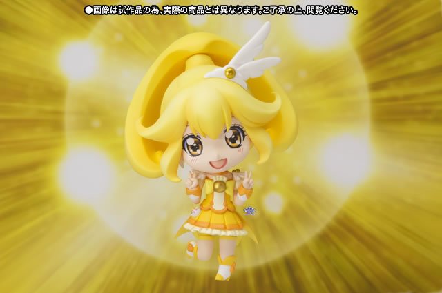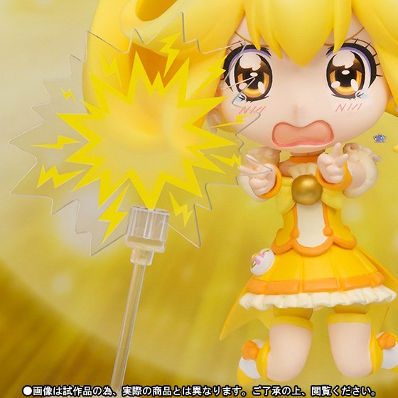 This Chibi-arts figure of Cure Peace measures 10 cm and has various accessories : various arms and legs parts, an « effect » reproducing the Peace Thunder attack, a set of onomatopoeia and some stands.