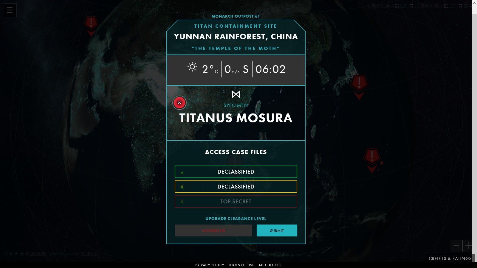 Pour nous donner plus d’informations sur nos monstres préférés, une page internet a été ouverte : www.monarchsciences.com. Nous devenons alors un opérateur civil de Monarch explorant la Terre. En cliquant sur les sigles clignotant, nous accédons à quelques points détaillés des monstres. Un dernier petit truc : si vous voyez une tâche rouge, n’hésitez pas à cliquer dessus. C’est un système pour traquer Godzilla en temps réel et depuis peu des photos peuvent y être ajoutées en utilisant le hashtag #MonarchSightings si l’équipe qui gère le site le décide.