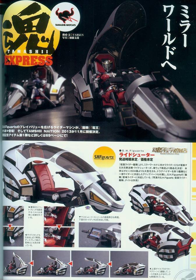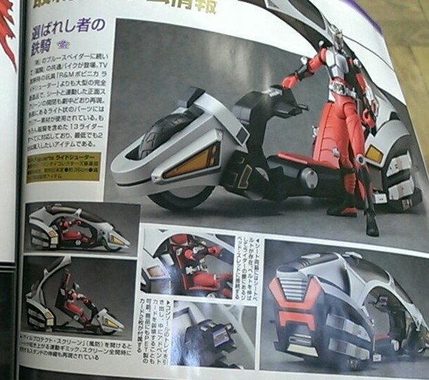 In the same vein, the S.H.Figuarts of the Ride Shooter, common motorcycle to all the riders in the Kamen Rider Ryuki series, and the Machine Den-Bird, the mount of Kamen Rider Den-O, are revealed for the first time, but as for the Hurricane of Kamen Rider V3, no date announced yet.