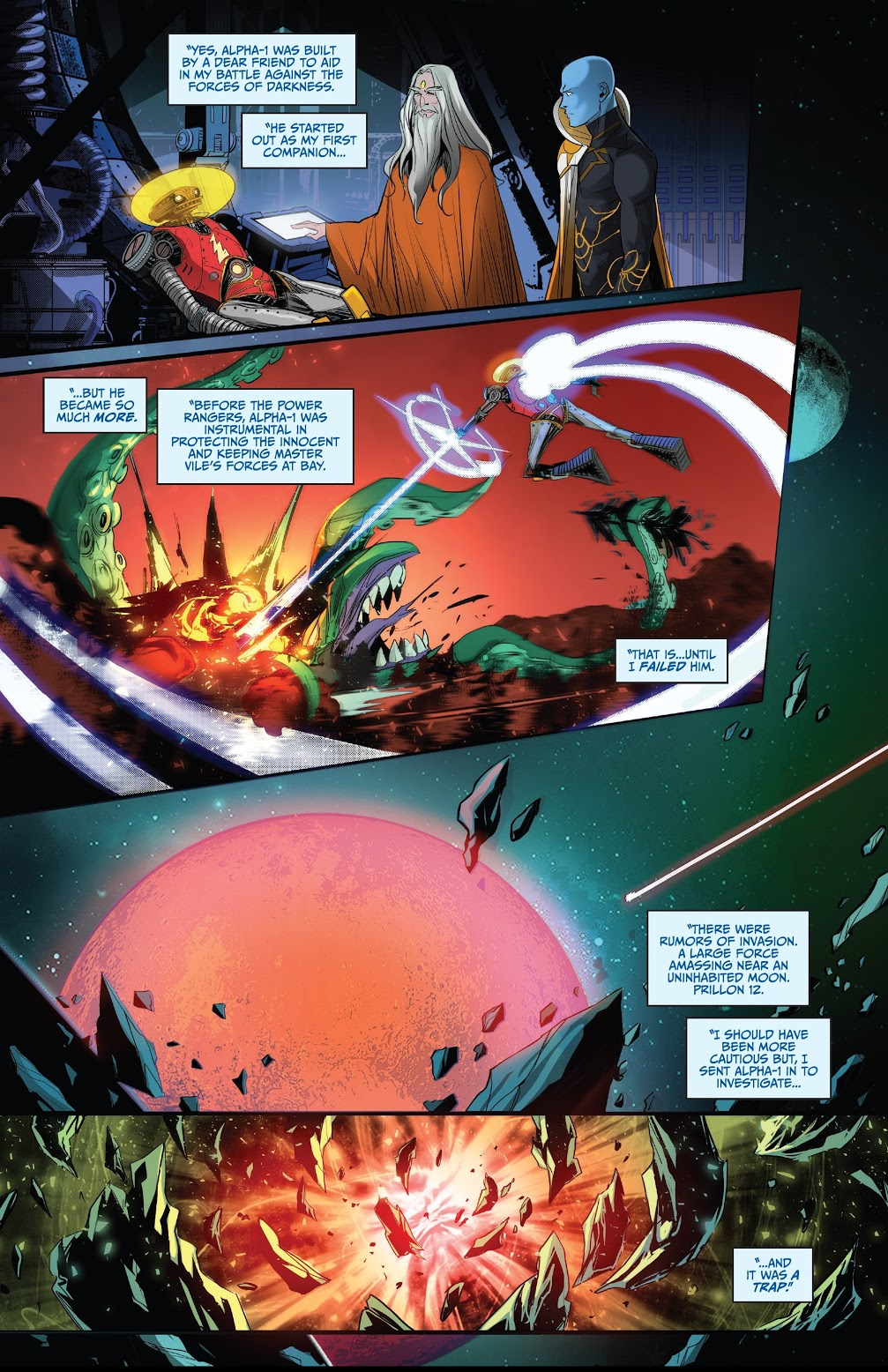 Cependant, il avait changé et était prêt à tuer tous celles et ceux qui mettraient en péril la paix dans l’univers. De plus, l’ancien héros était convaincu d’avoir été abandonné par Zordon. Malgré les tentatives de raisonnement de son ancien ami et maître, Alpha-1 décida de l’éliminer ainsi que ses protégés. L’affrontement fut rude mais avec l’aide aussi inattendue qu’espérée d’Alpha-5, Alpha-1 fut neutralisé. Dans un dernier sursaut d’orgueil, il avertit les Rangers qu’il reviendrait avant de s’autodétruire…