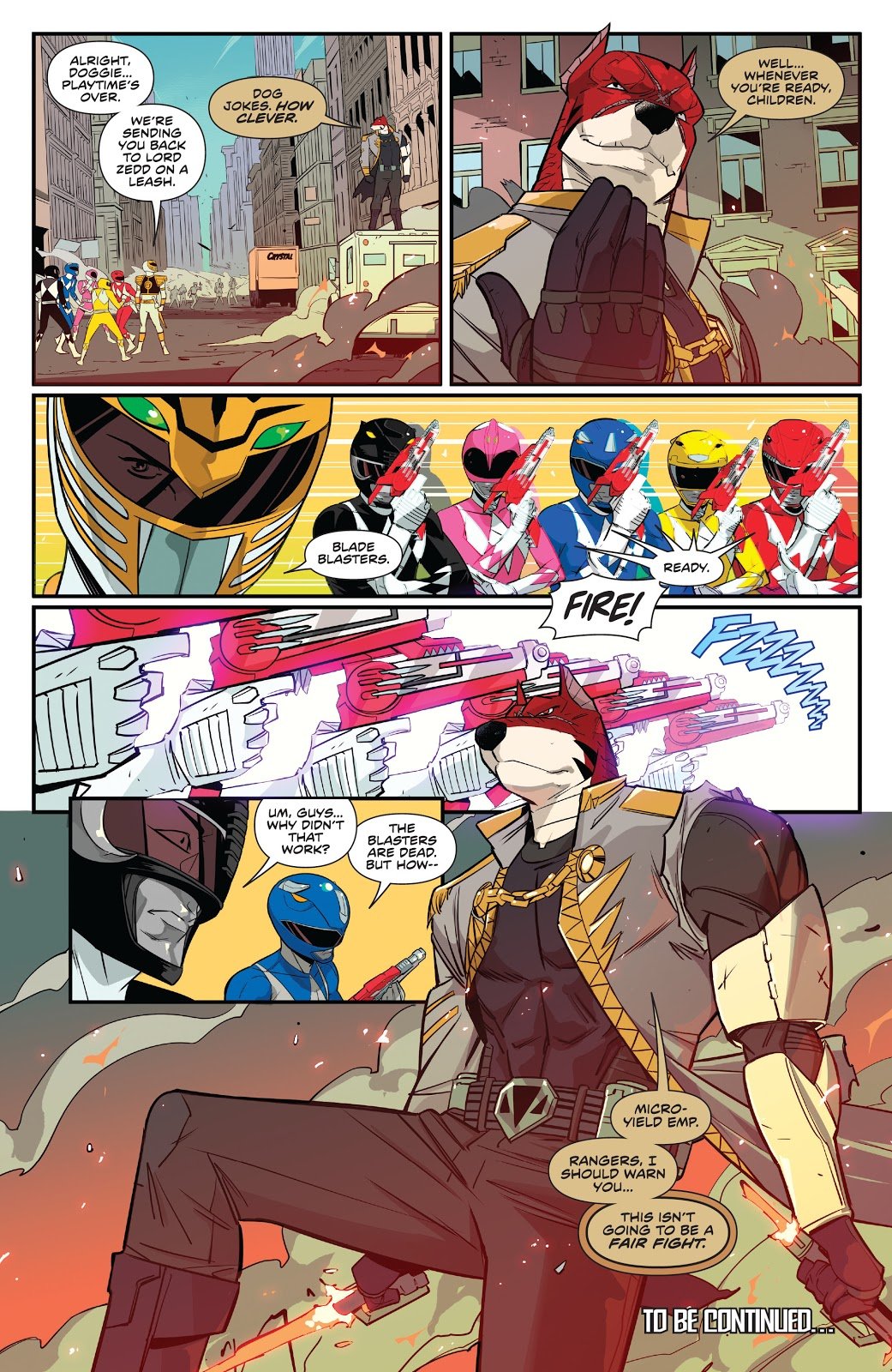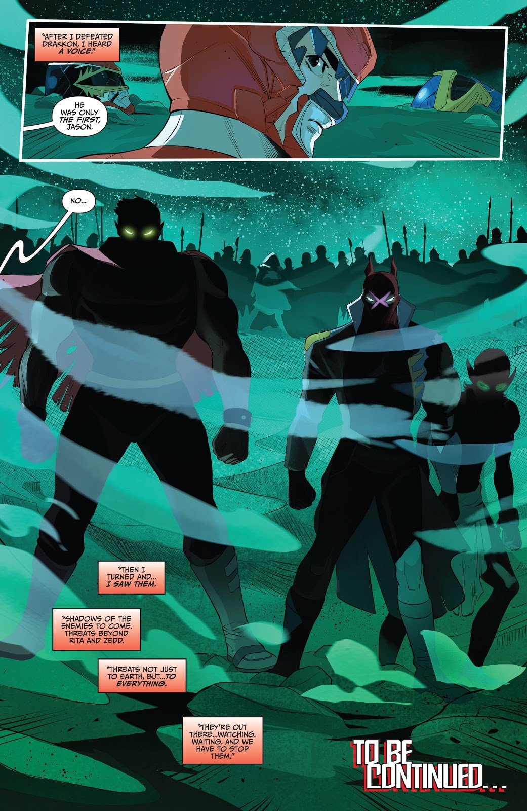 Parmi ces menaces, on reconnaît les silhouettes du Chasseur de Primes Dayne (engagé par Zedd à la fin de l’épisode 40 des comics Mighty Morphin Power Rangers) et Garrison Vox (apparu lors de l’épisode 41 des comics Mighty Morphin Power Rangers face aux Omega Rangers). C’est sans doute peu de temps après que Trini et Zack suivront Jason pour devenir les Omega Rangers.