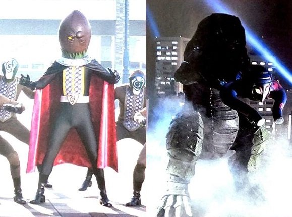 Rugby Jamenshi (photo de gauche) sera le premier monstre à apparaître. Il est directement inspiré de Yakyu Kamen, l’un des monstres phares de Goranger, sauf que son sport à lui est le rugby.