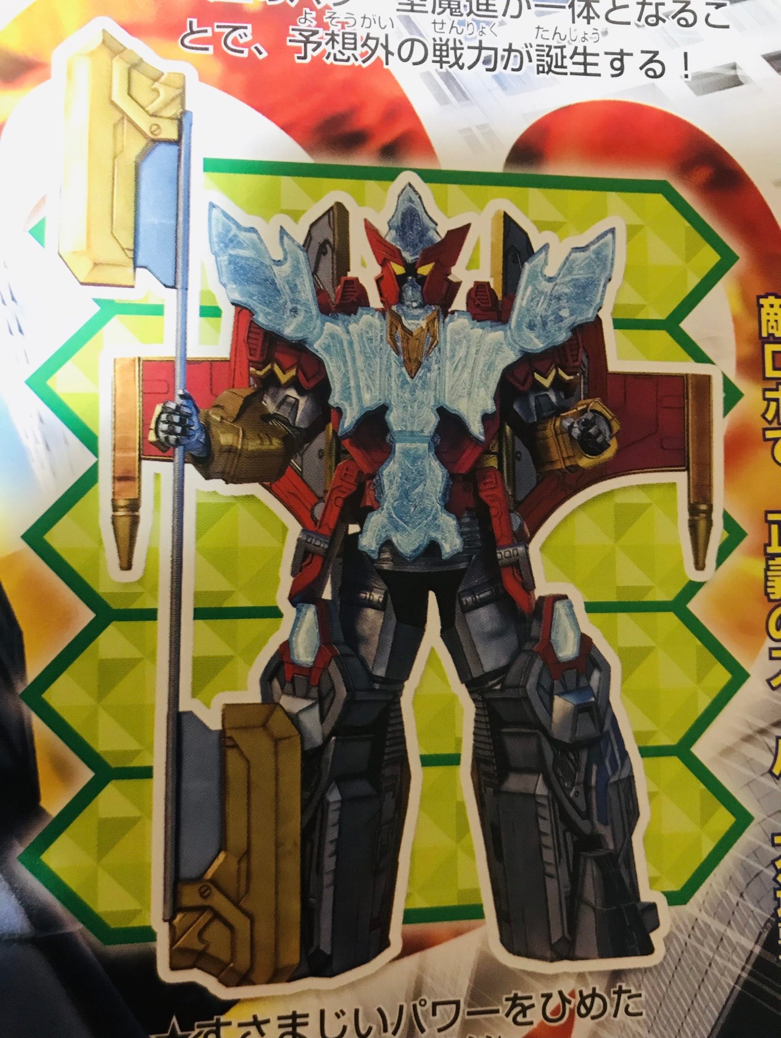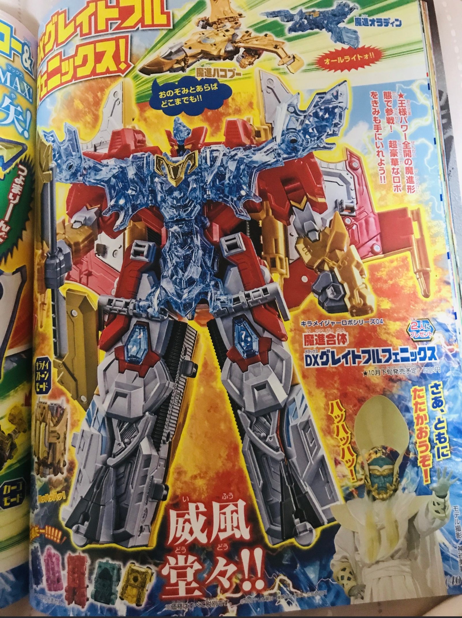 If King Oradeen’s body seems to be dead, his spirit is not. He will become a crystal phoenix Mashin, Mashin Oradeen, and combine to a golden plane Mashin, Mashin Hakobu (transporter), to become the giant robot Greatful Phoenix ! Armed with its double axe, it is surely the most powerful robot of our heroes.