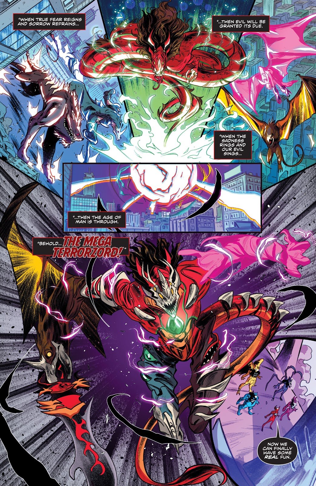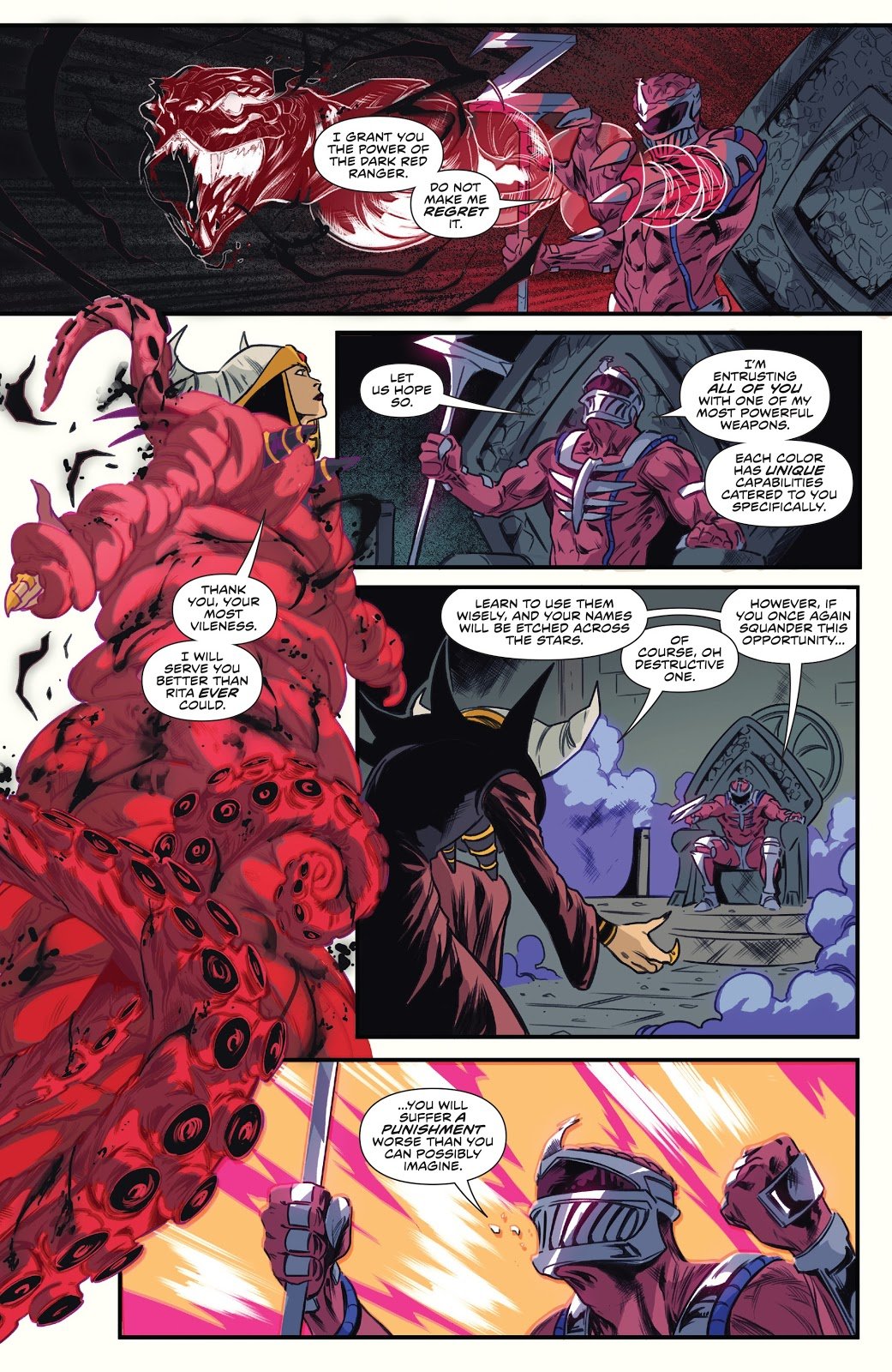 Dans le dernier article consacré aux comics Mighty Morphin Power Rangers, Rita Repulsa réapparaissait afin de prendre la tête des nouveaux Dark Rangers. On découvre par la suite qu’il s’agit d’un clone Putty créé par Finster pour remplacer l’originale. Satisfait par ses capacités, le Seigneur Zedd lui octroie les pouvoirs du Dark Ranger rouge. Après avoir précisé que chaque couleur octroyait des pouvoirs différents, Zedd avertit ses Rangers : l’échec n’est pas envisageable.