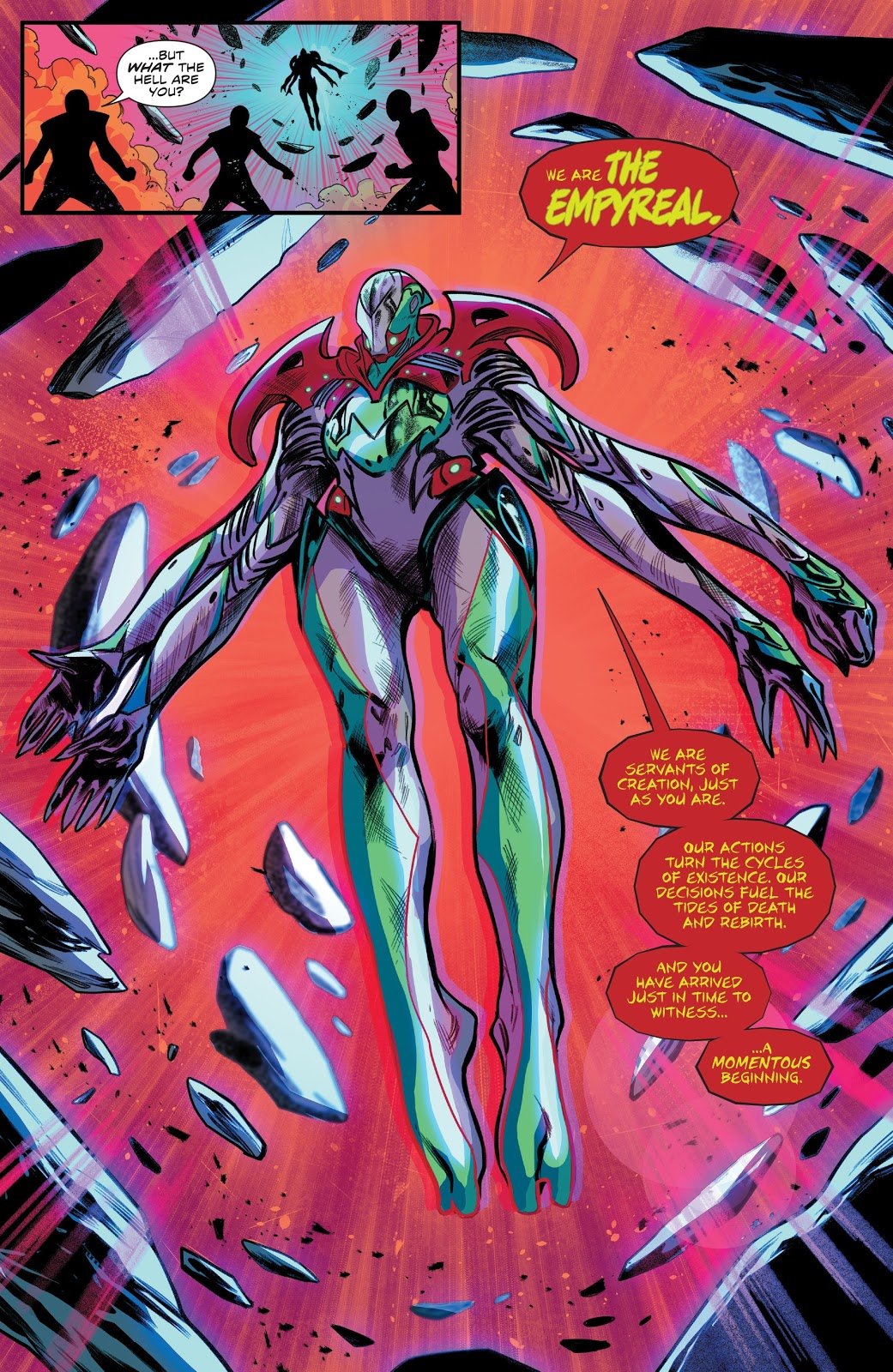 Les Omega Rangers sont confrontés à ceux qui ont terrifié Lord Drakkon : les Empyreal qui ont détruit la planète Gorvinos 3. Tels des Juges cosmiques, ils estiment que le temps des Gorvinians est révolu et que la planète doit renaître. Jason, Zack et Trini décident donc de stopper les Empyreal afin d’empêcher de nouveaux génocides planétaires. Malgré leur bravoure, le trio n’est pas de taille face ces nouveaux ennemis. Ils révèlent avoir annihilé des civilisations entières, tué des Dieux et l’Émissaire rouge du trio des Émissaires. Devant la toute puissance de ces nouveaux antagonistes, les Omega Rangers n’ont pas d’autre choix que de fuir et y parviennent tant bien que mal.